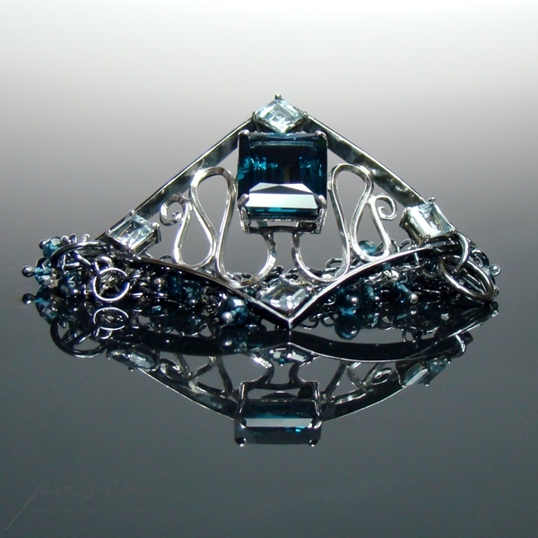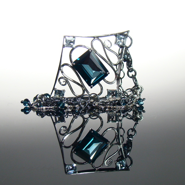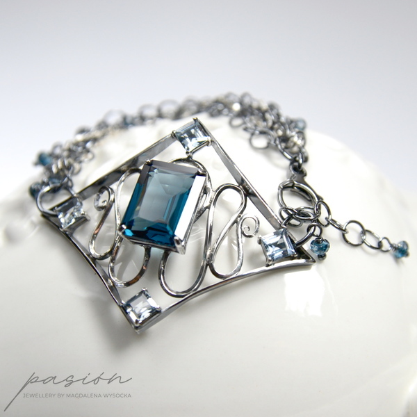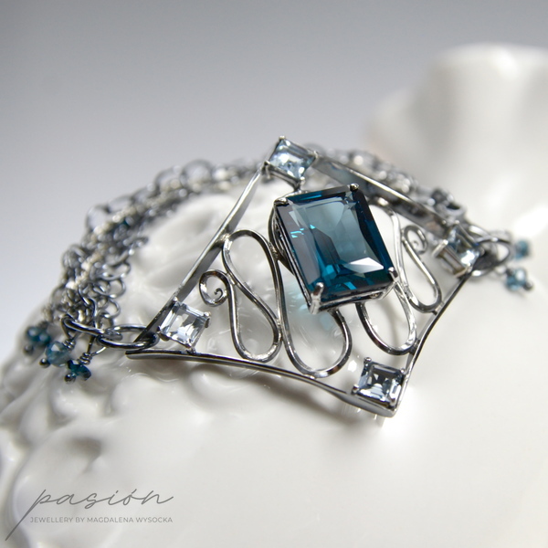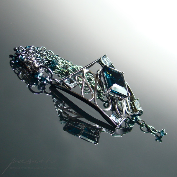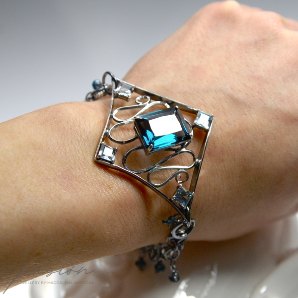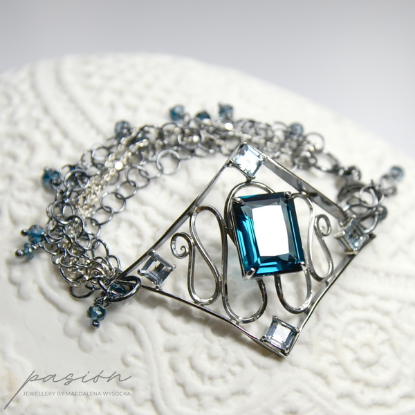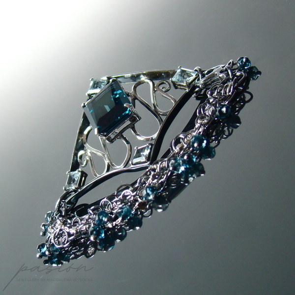 Sercem bransoletki jest Topaz London Blue o przepięknym szlifie „emerald" i turkusowym odcieniu oprawiony w klasyczne "łapki". Otaczają go srebrne fale wypełnione kwadratowymi Akwamarynami. Na wielu łańcuszkach zawisły oponki mikrofasetowanych Topazów London Blue. Zakończenie łańcuszka przedłużającego zdobi fasetowana kula Topazu.