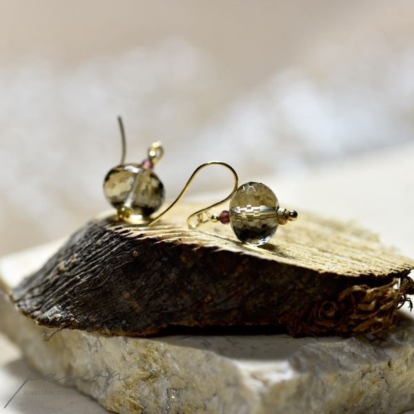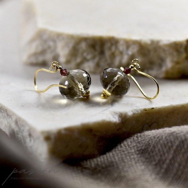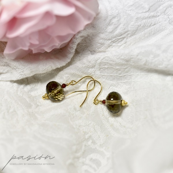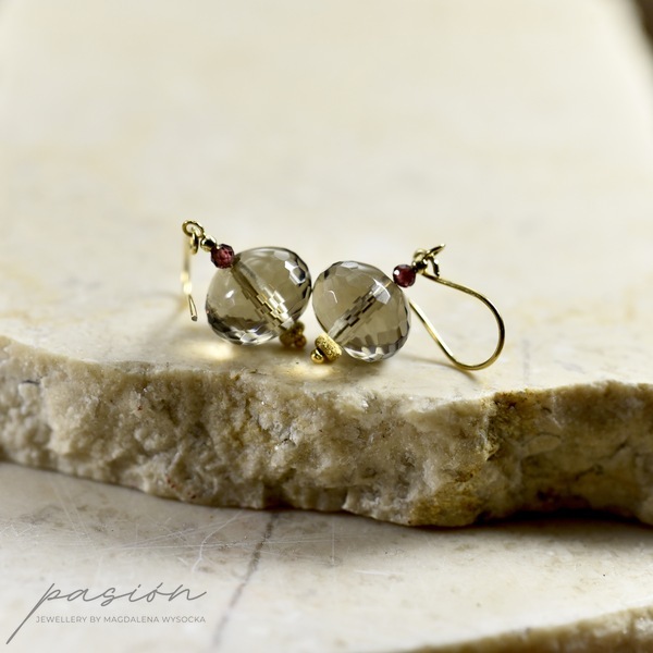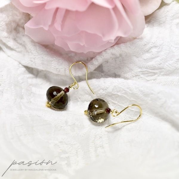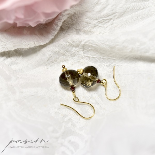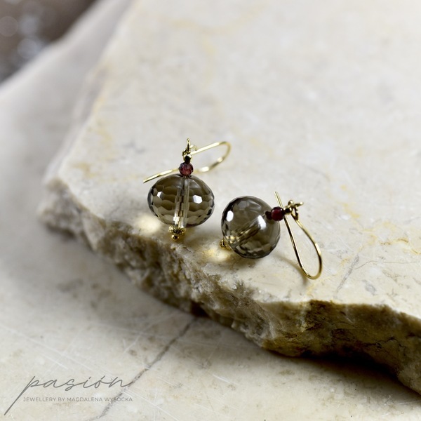 Kolczyki ozdobione zostały fasetowanymi owalami Kwarcu dymnego oraz uroczymi mikrofasetowanymi kulami Granatu.