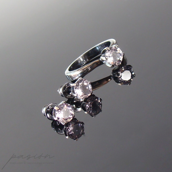 Niezwykle kobiecy komplet biżuterii złożony z pierścionka i kolczyków na sztyftach ozdobionych najwyższej jakości jasnoróżowymi Morganitami o niecodziennym, diamentowym szlifie i blasku.