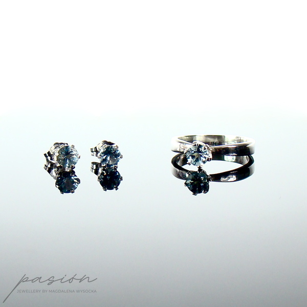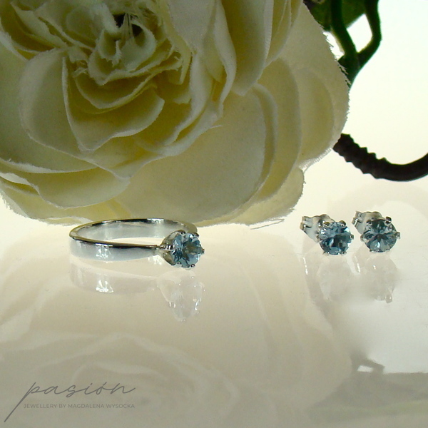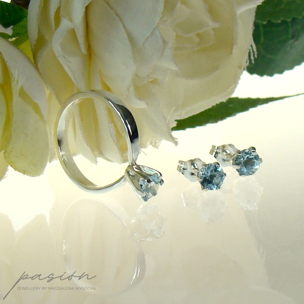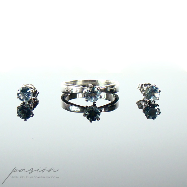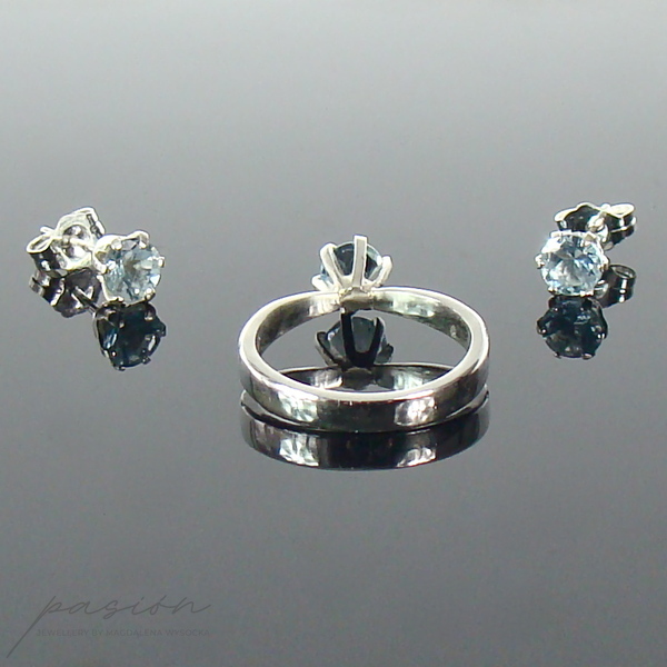 Srebrny, klasyczny komplet biżuterii wykonanej ręcznie ze srebra pierwszej próby 925, ozdobiony naturalnymi Akwamarynami o szlifie diamentowym i średnicy 5mm.