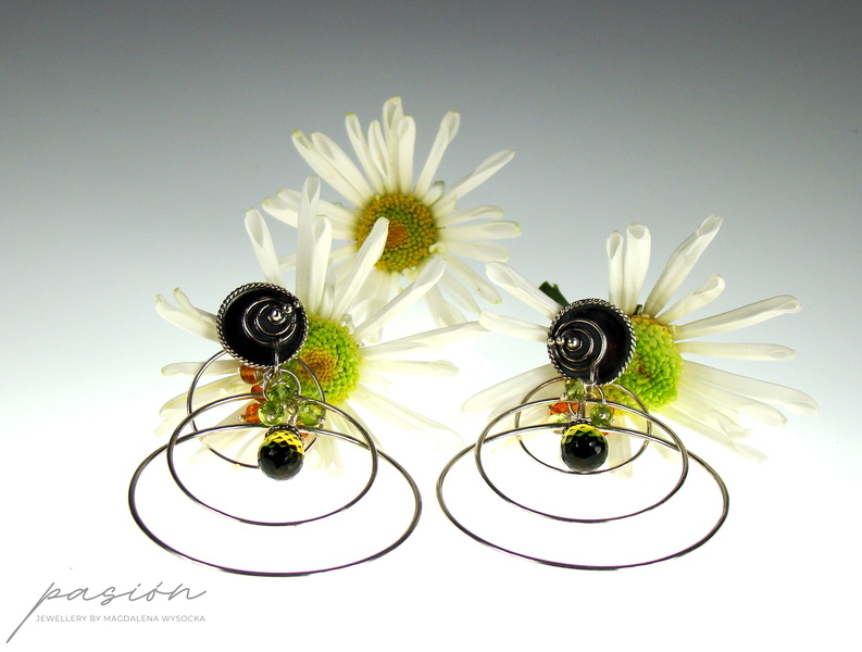 Okazałe kolczyki wykonane od podstaw ze Srebra pierwszej próby 925 to trzy koła, które zawisły na sztyfcie imitującym naturalne satelity oraz ich orbity. Pomiędzy srebrnymi kołami wplecione zostały kamienie szlachetne o optymistycznej kolorystyce zieleni i pomarańczu: dwukolorowa zielono-żółta brioletta Kwarcu, miodowe Cytryny Madeira oraz Peridoty.
