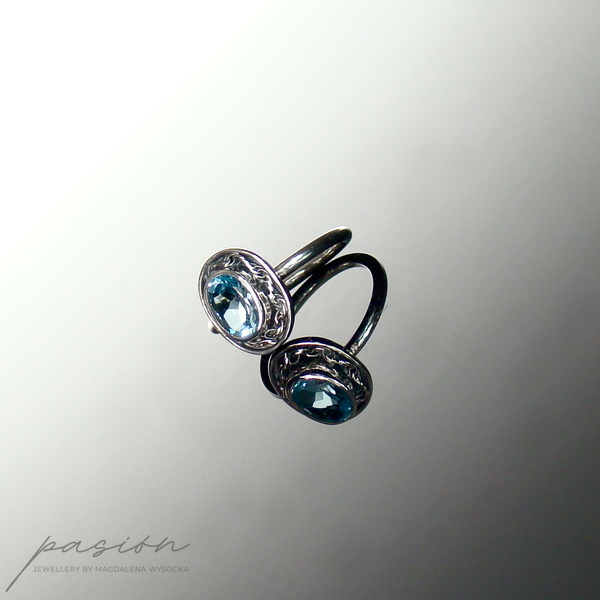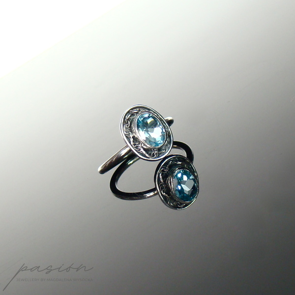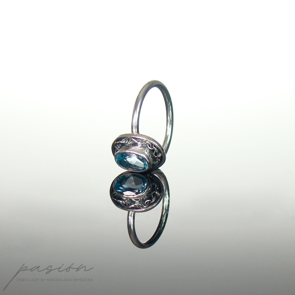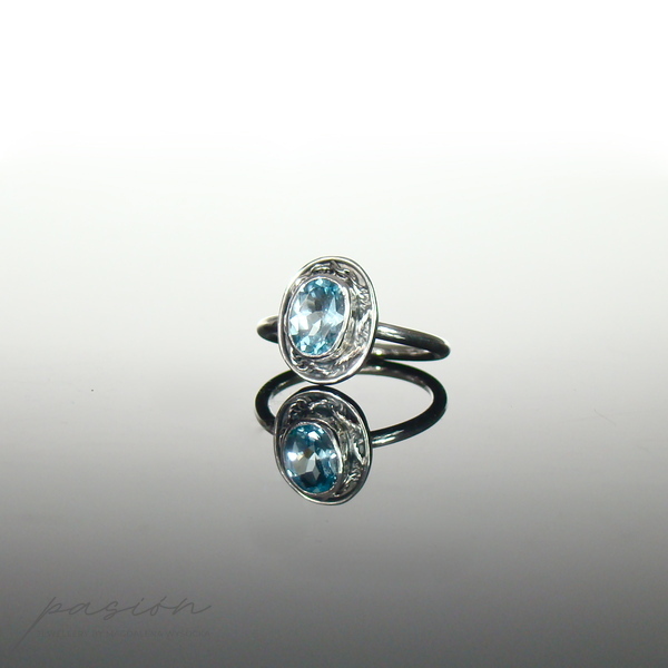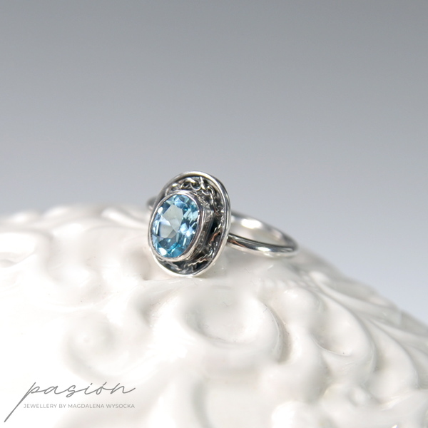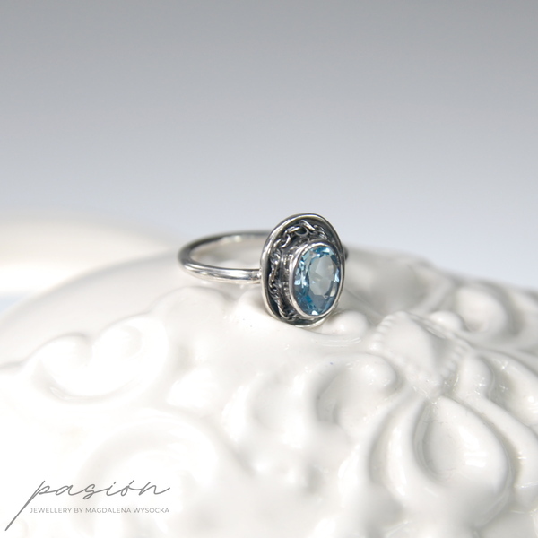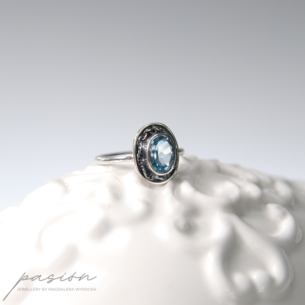Główną ozdobą pierścionka jest piękny fasetowany Topaz Sky Blue otulony srebrną rzeźbą. Obrączka jest w przekroju okrągła.