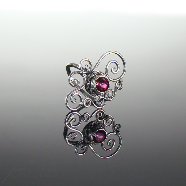 Oprawiony w srebro czerwony Topazy o szlifie diamentowym otoczony zostały srebrnymi zdobienami tak, aby całość tworzyła asymetryczną, elegancką formę na drobnej obrączce, świetnie prezentującą się na palcu.