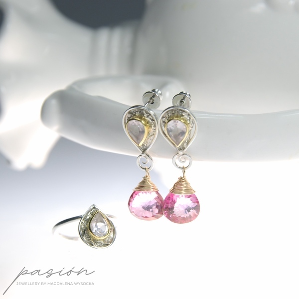 Pierścionek został oryginalnie ozdobiony oprawionym w złocone srebro fasetowanymi kamieniami Kwarcu Różowego w kształcie łezki.