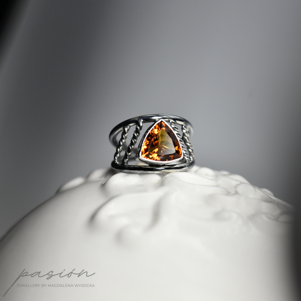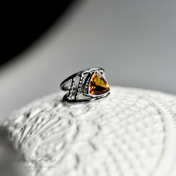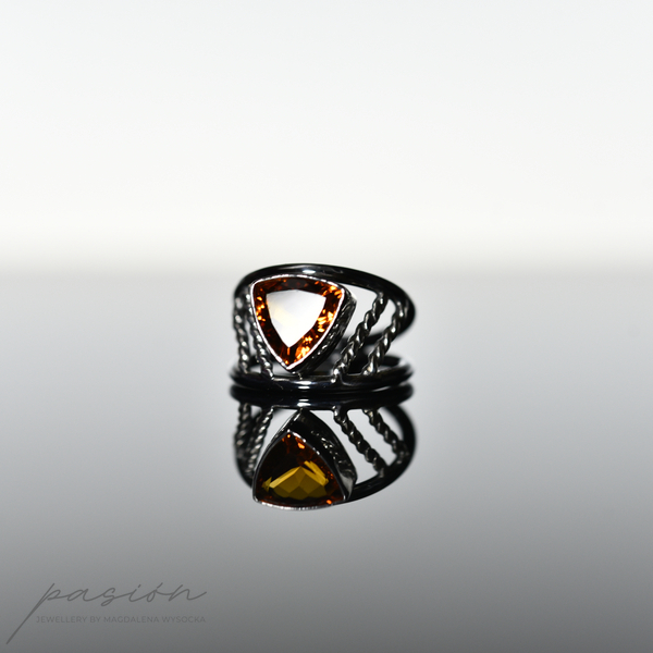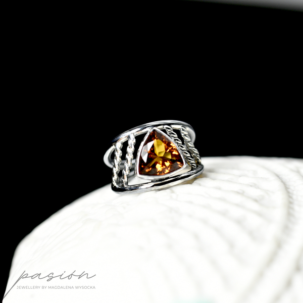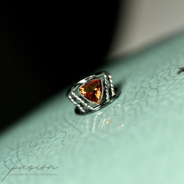 Główna ozdobą pierścionka jest niespotykany ognisty Cytryn madeira o najwyższej jakości szlifie, wydobywajacy jak największą ilość światła, w kształcie trójkąta.