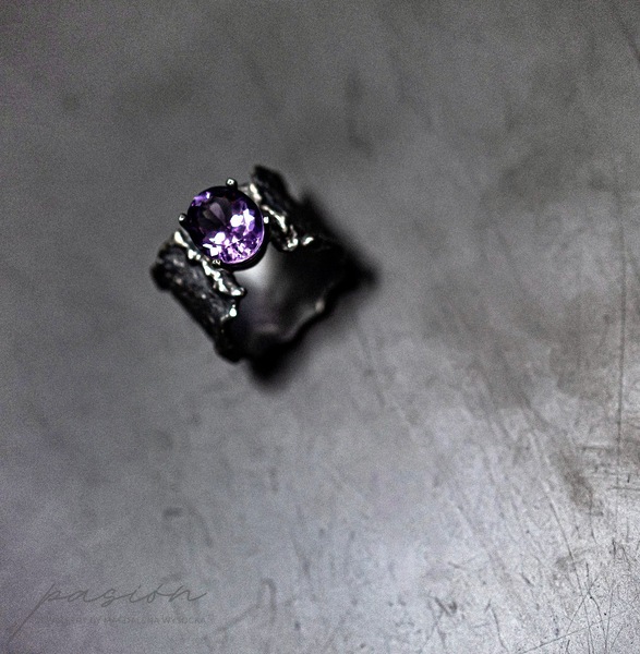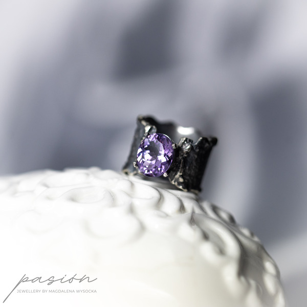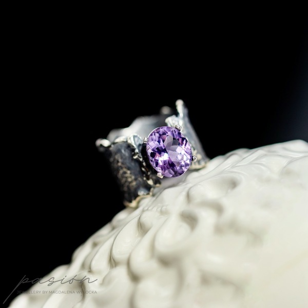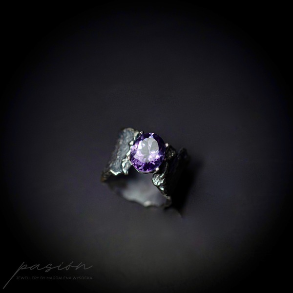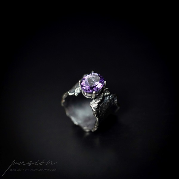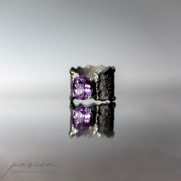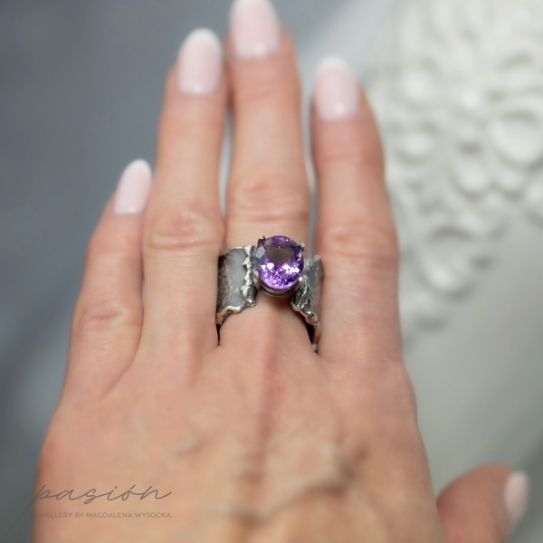 Szeroki pierścień wykonany ręcznie ze srebra próby 925 i 999, ozdobiony przepięknym, naturalnym Ametystem o jasnej wrzosowej barwie, oprawionym w cztery "łapki".