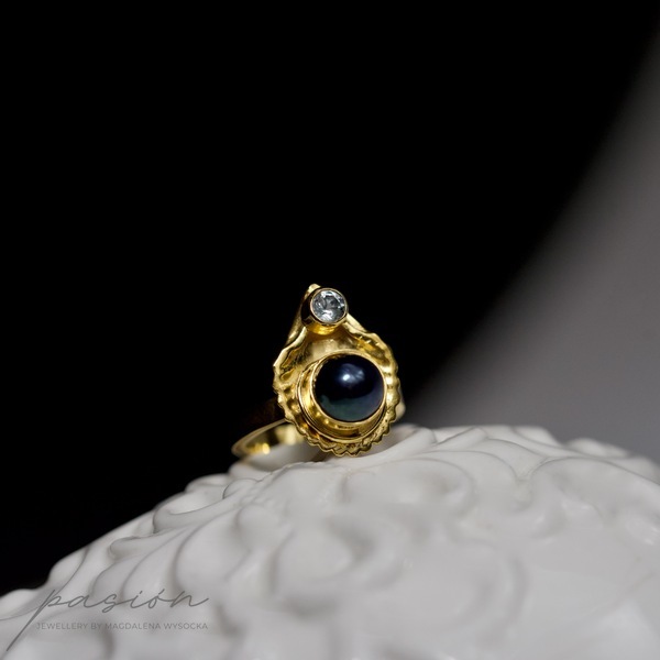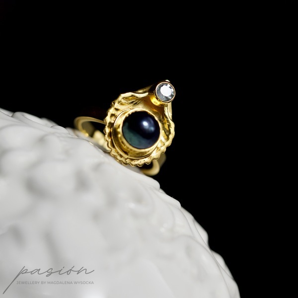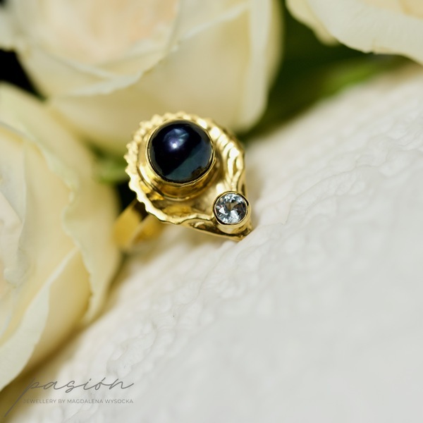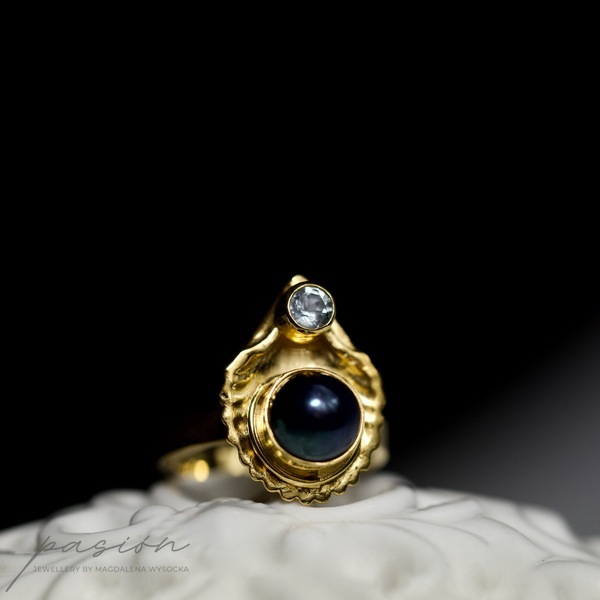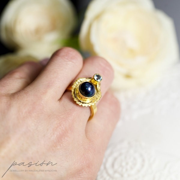 Wykonany ręcznie srebrny pierścionek z morskim motywem muszli, ozdobiony najwyższej jakości czarną naturalną Perłą oraz jasnobłękitnym Akwamarynem.