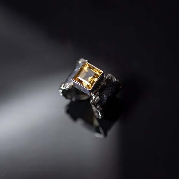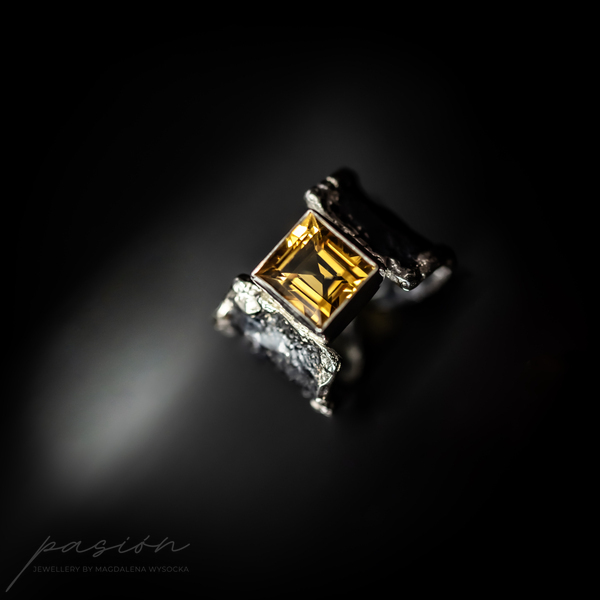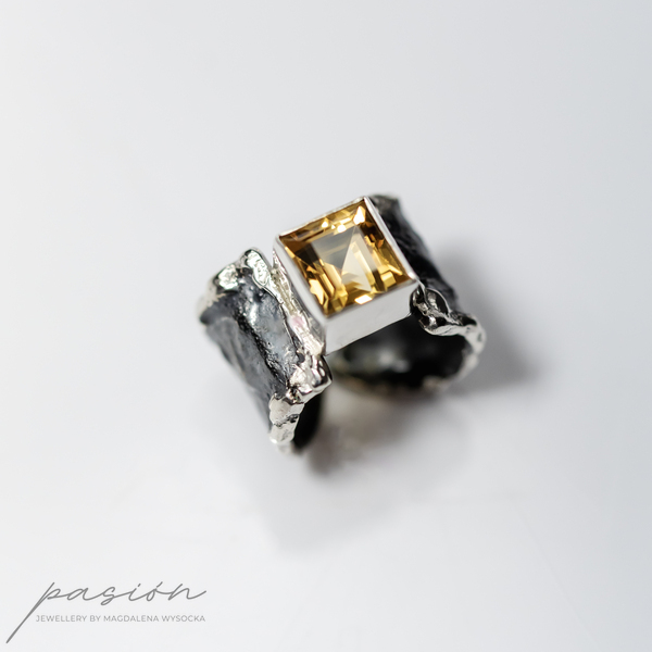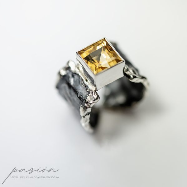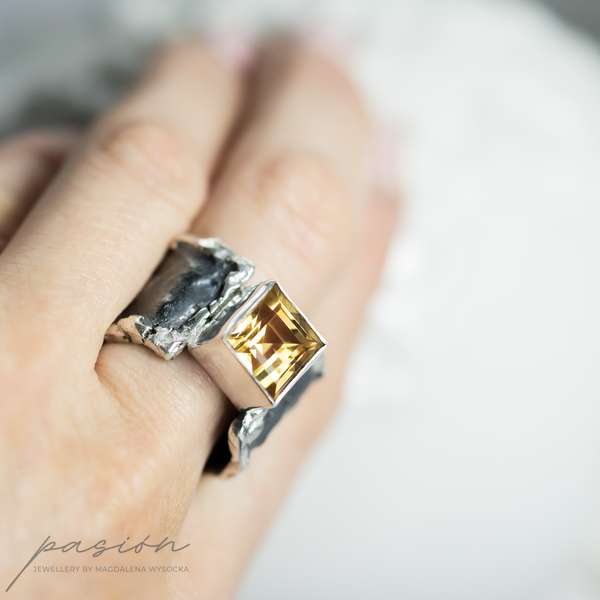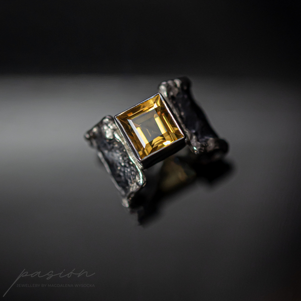 Szeroki pierścień wykonany ręcznie ze srebra próby 925 i 999, ozdobiony przepięknym, naturalnym Cytrynem o jasnej barwie i prostokątnym kształcie.