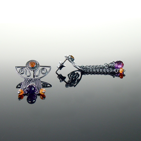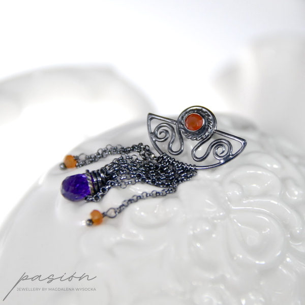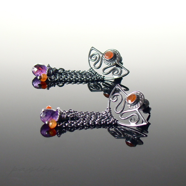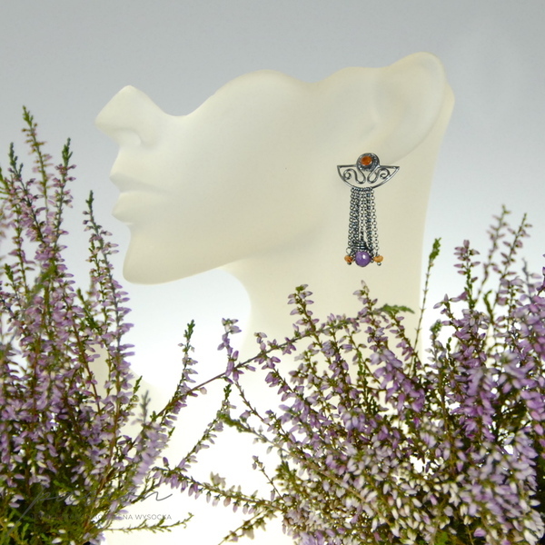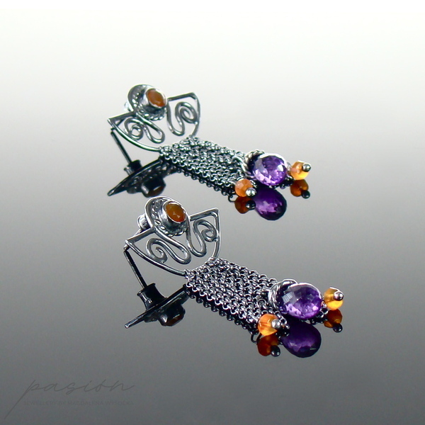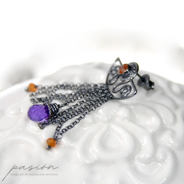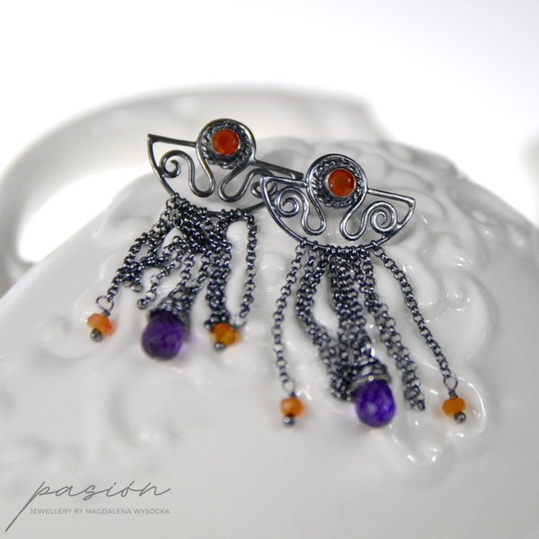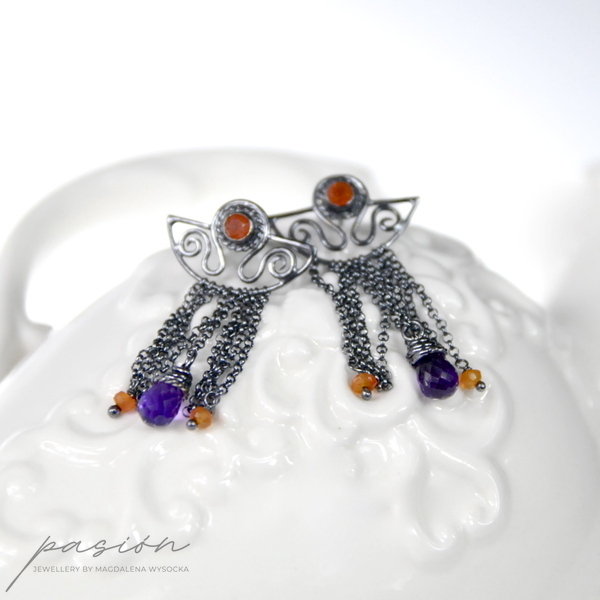 Kolczyki zostały wykonane ręcznie z intensywnie zoksydowanego na czarny, wysoki połysk srebra próby 925, pomarańczowych Karneoli oraz brioletek brazylijskich Ametystów.