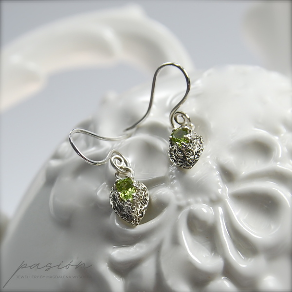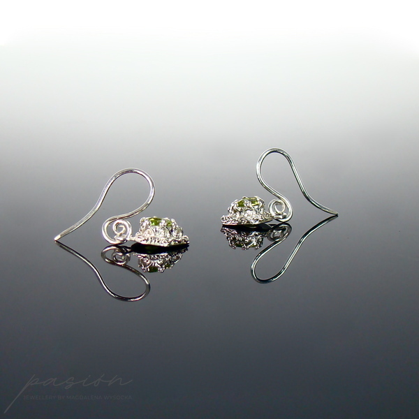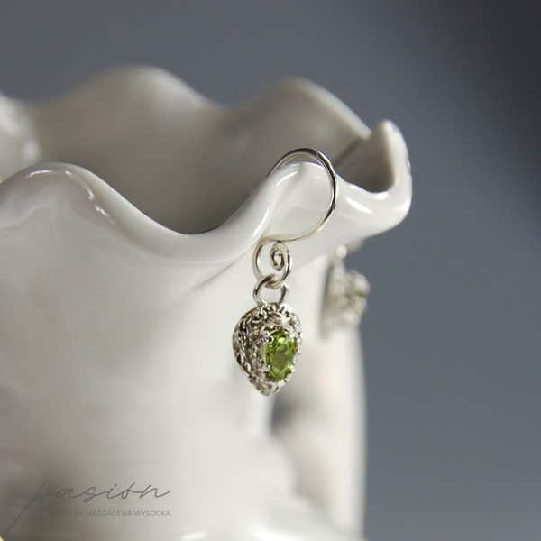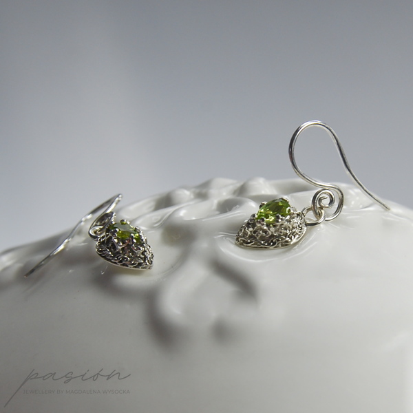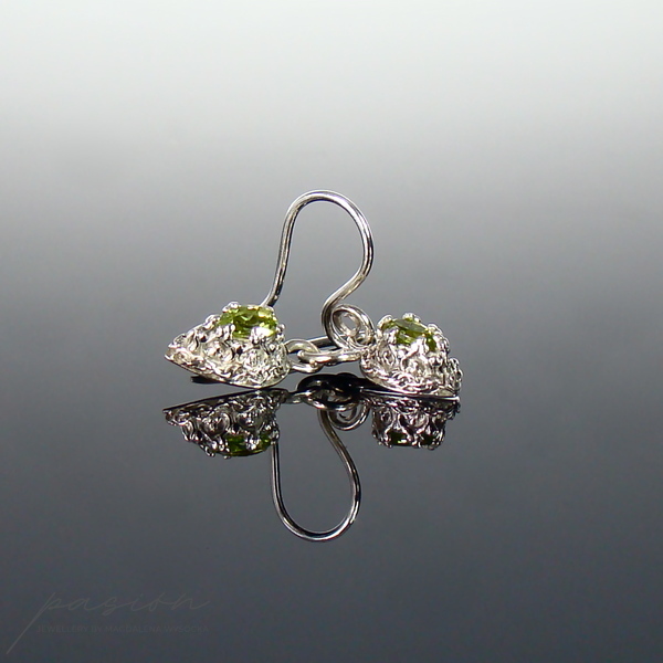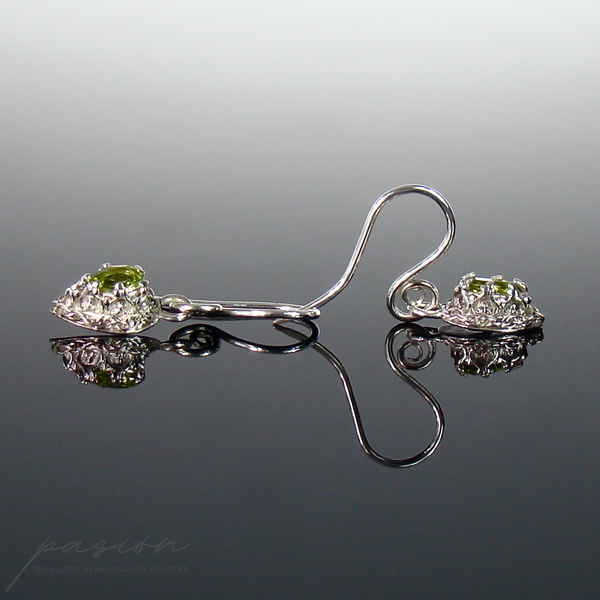 Kolczyki zostały wykonane z fasetowanych lemonkowych Peridotów w kształcie kropel (7 x 5 mm) oprawionych w srebrną koronę.