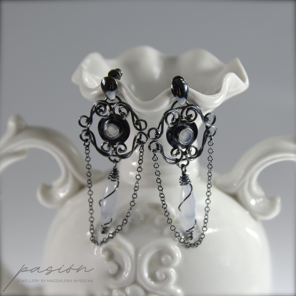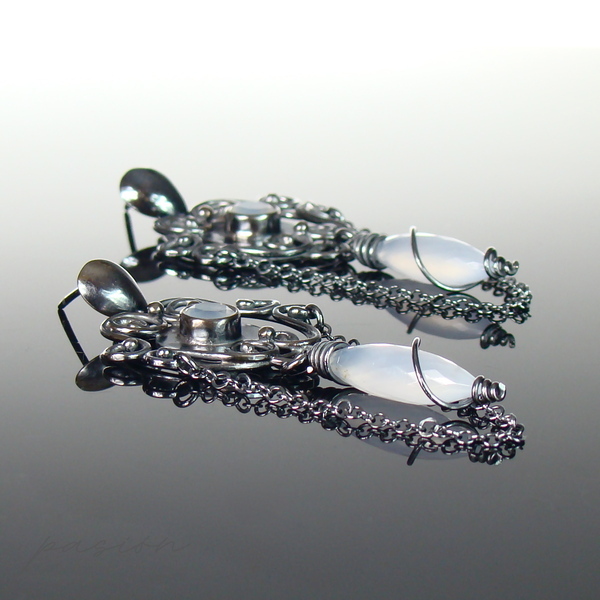 Szykowne kolczyki w stylu glamour wykonane ręcznie ze srebra pierwszej próby 925 z przepięknymi, najwyższej jakości, naturalnymi, fasetowanymi Chalcedonami o gołębim odcieniu, ozdobione łańcuszkami.
