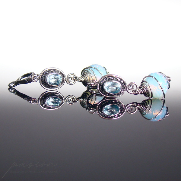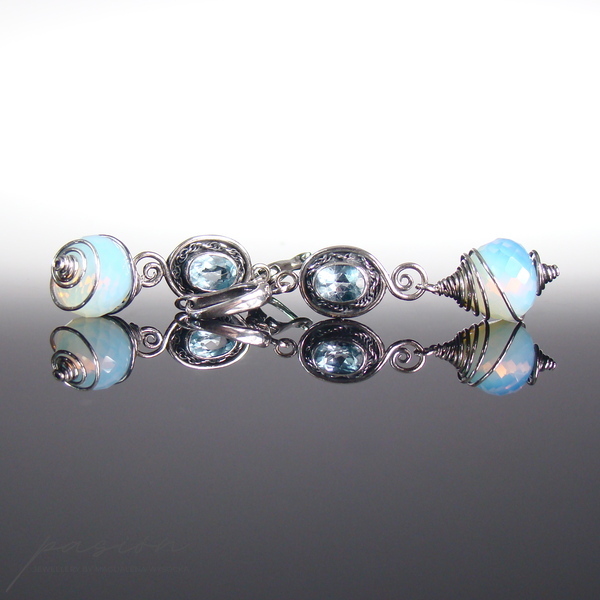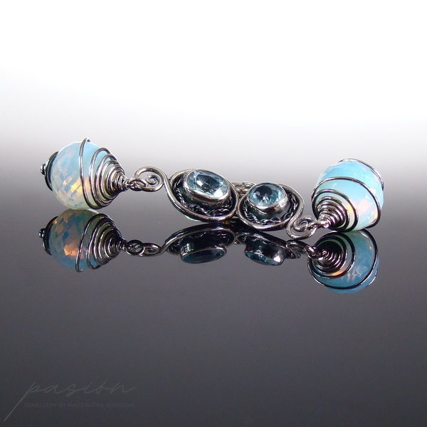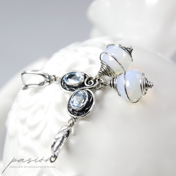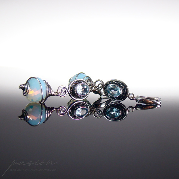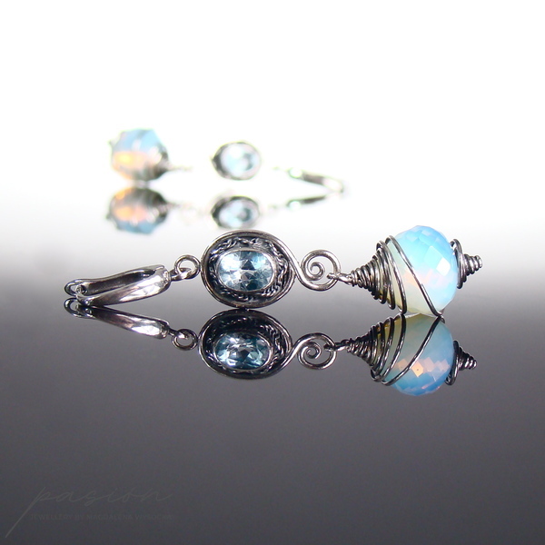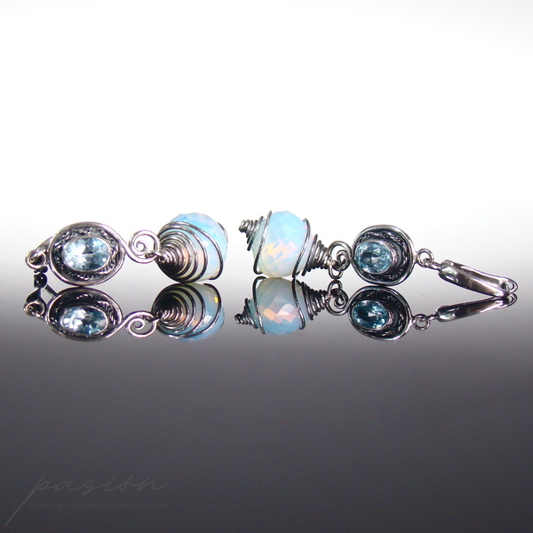 Kolczyki ozdobione zostały owalnymi Topazami Sky Blue, oprawionymi w srebro oraz ognistymi Opalitami w kształcie „cebulek”, mieniącymi się rajskimi kolorami, wśród których dominuje mleczny błękit. Kolczyki są zawieszone na angielskich biglach, zoksydowane i intensywnie wypolerowane. Istnieje możliwość wykonania kolczyków z innymi biglami lub na sztyftach.