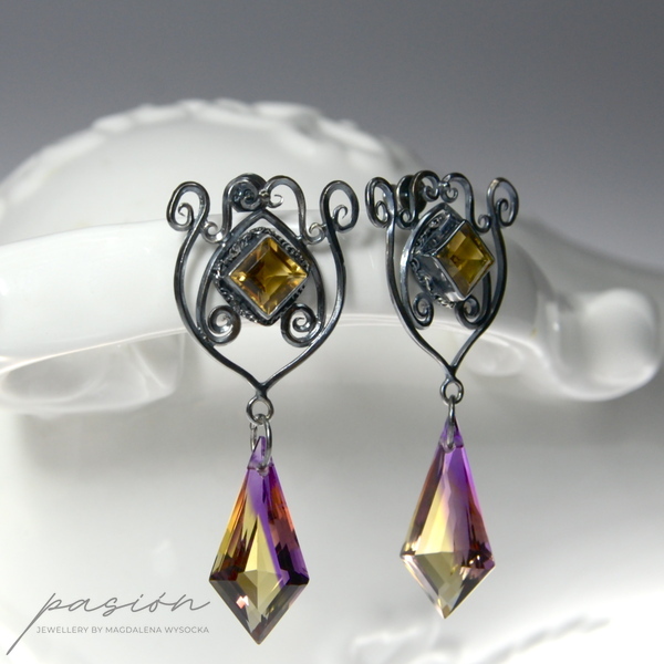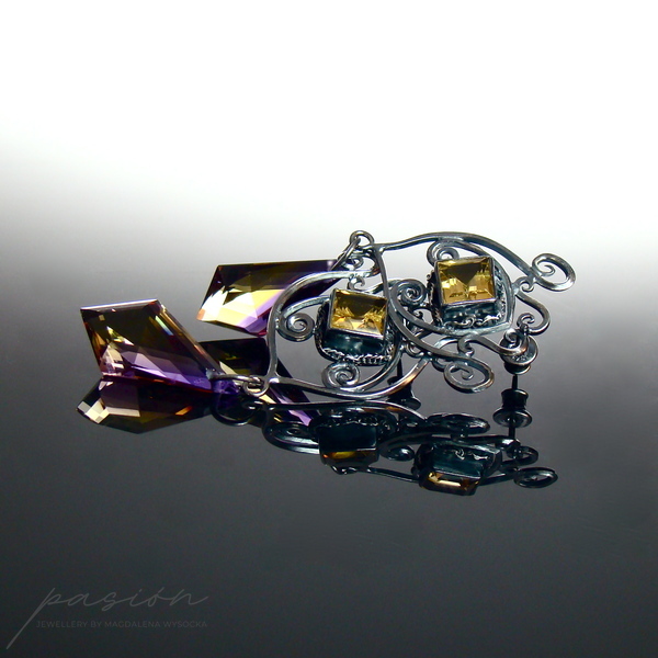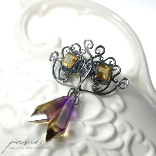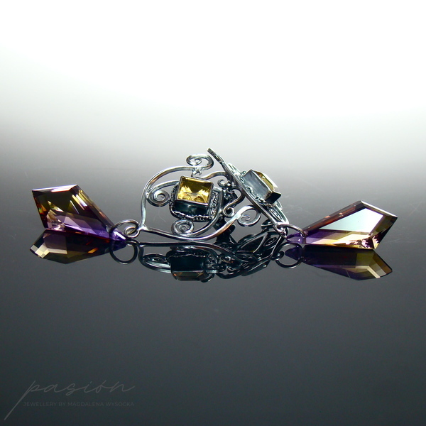 Oryginalne w formie, nieco tajemnicze kolczyki na sztyftach ozdobione najwyższej jakości kwadratowymi Cytrynami oraz dwukolorowymi Ametrynami o niezwykle rzadkim i nietypowym kształcie. Ametryn to kamień szlachetny łączący Cytryn i Ametyst, stąd mieni się odcieniami fioletu, ciemnego złota i żółtego.
