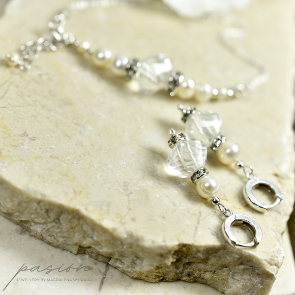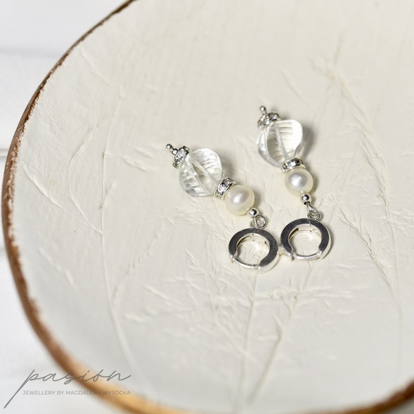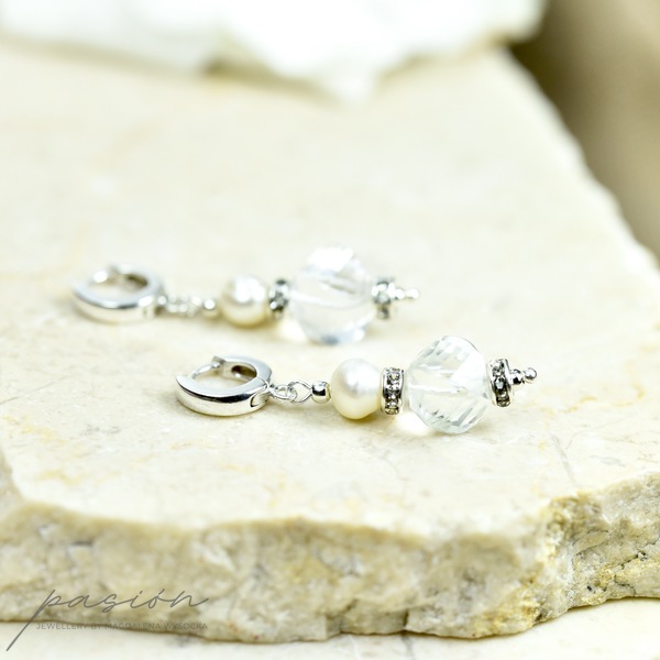 Eleganckie kolczyki wykonane ręcznie ze srebra pierwszej próby 925 z Kryształem górskim i Perłą.