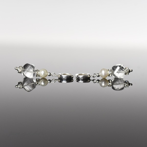 Na srebrnych okrągłych, zapinanych biglach zawisły kolczyki ozdobione fasetowanym spiralnie Kryształem górskim, w otoczeniu naturalnej słodkowodnej Perły oraz srebrnych przekładek z cyrkoniami.