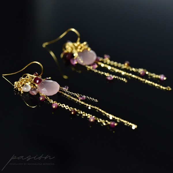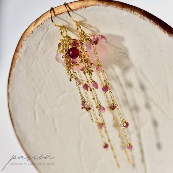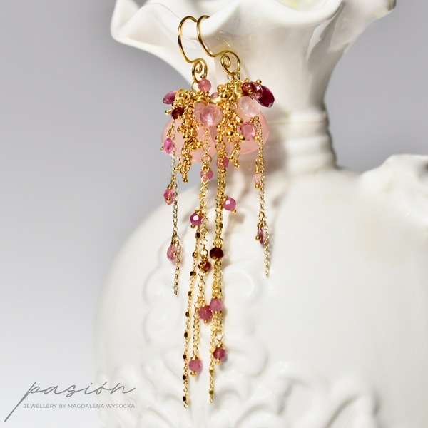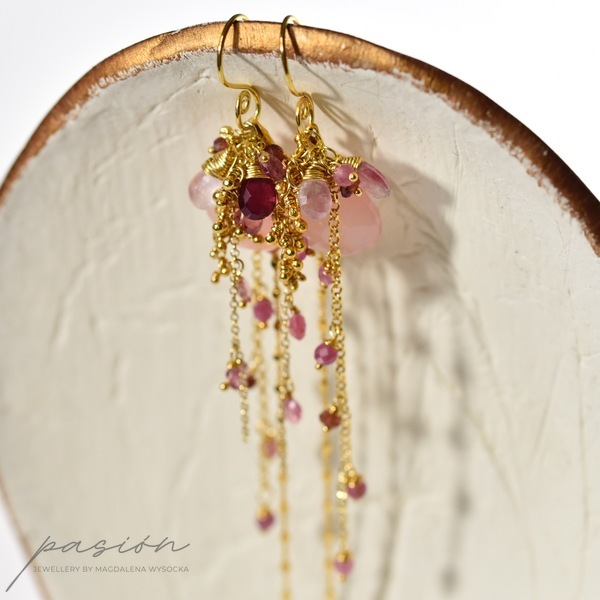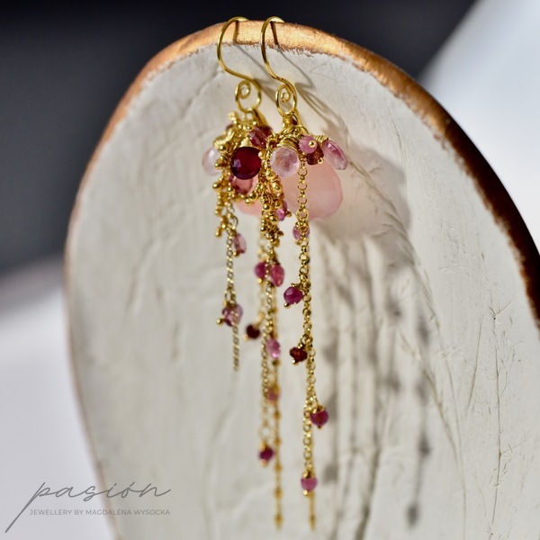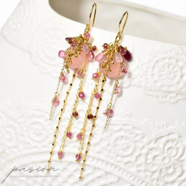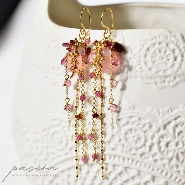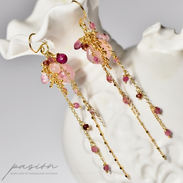 Wykonane ręcznie złocone kolczyki (srebro złocone 24ct złotem) z naturalnymi kamieniami w odcieniach różu: różowym Chalcedonem,  różowymi Turmalinami o różnych kształtach oraz Granatami w otoczeniu złotych dodatków.