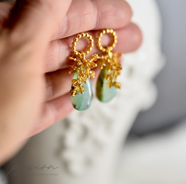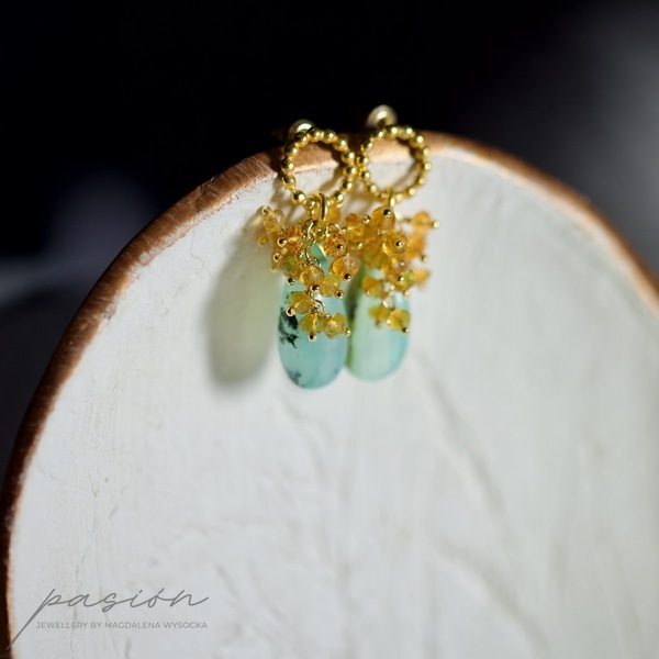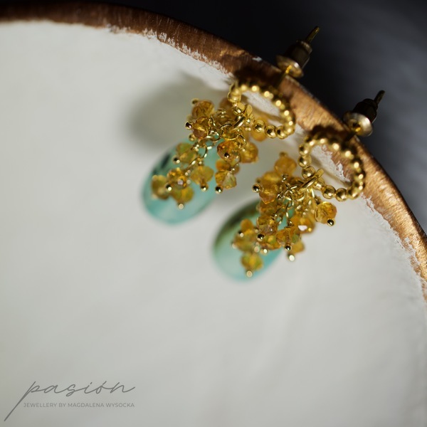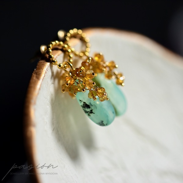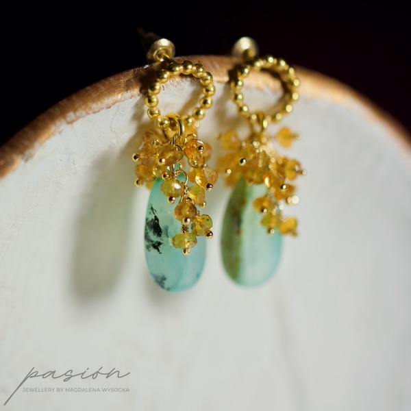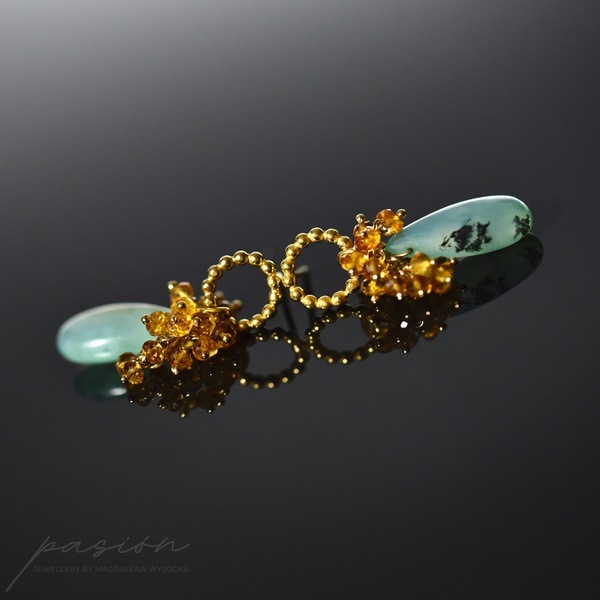 Kolczyki ozdobione są kroplami zielonych Opali dendrytowych (każdą sztuka ma inne wzory dendrytowe) oraz kaskadą Cytrynów Madeira o intensywnej ciemnożółtej barwie, w otoczeniu złoconych elementów.
