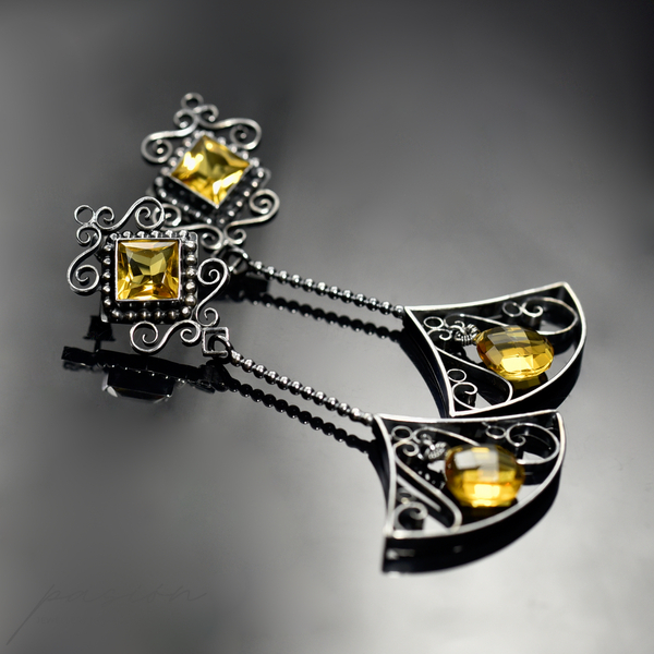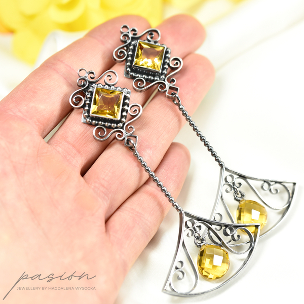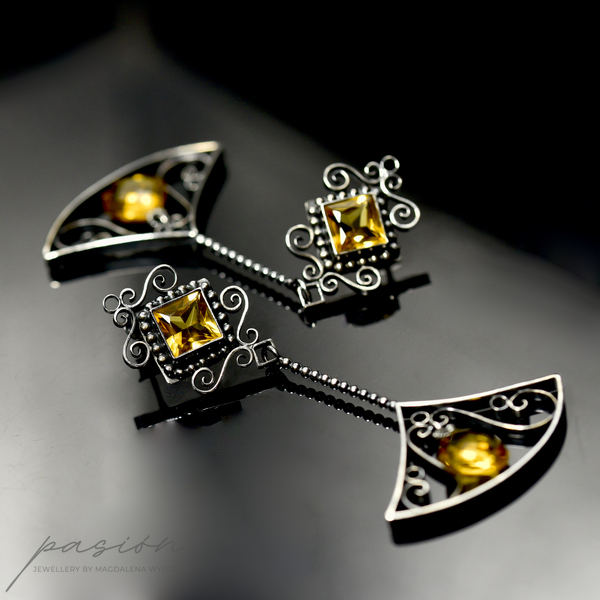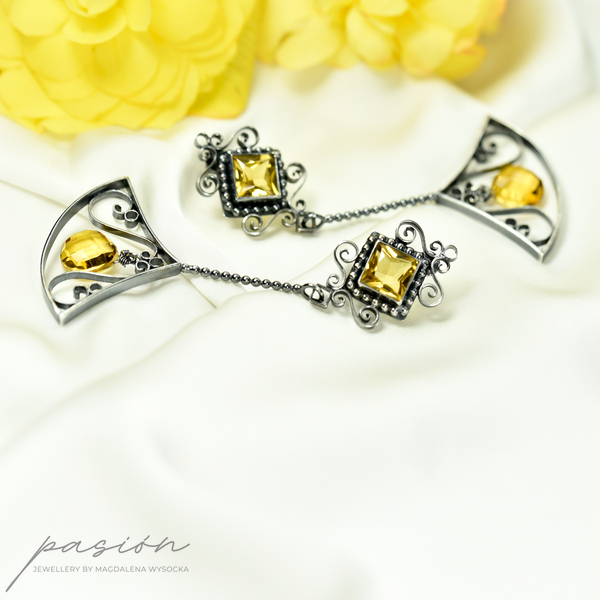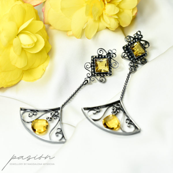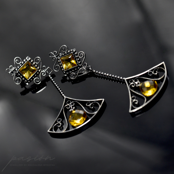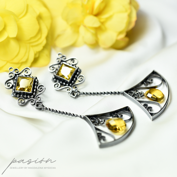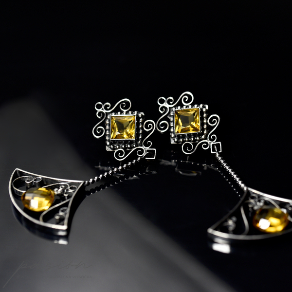 Kolczyki wykonane zostały ręcznie z oksydowanego na czarno srebra próby 925, ozdobione najwyższej jakości fasetowanym, złocistymi Cytrynami o kwadratowym kształcie oraz brioletką Cytrynu w kształcie odwróconego serca.