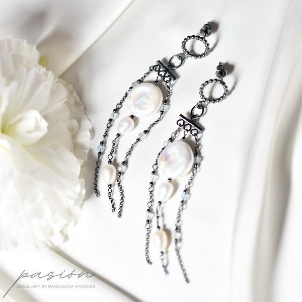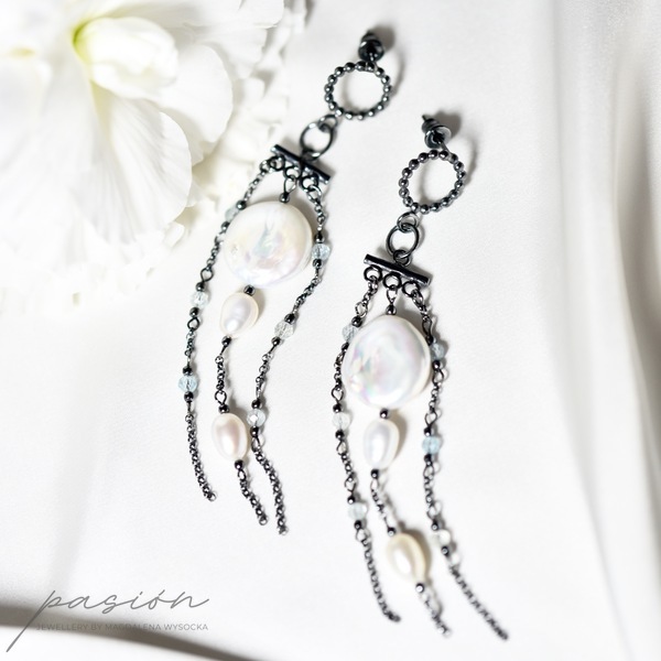 Kolczyki zostały ozdobione łańcuszkami pełnymi naturalnych Pereł w ksztacie monetek i ryżu oraz fasetowanymi kulami Akwamarynów w odcieniu jasnoniebieskim.
