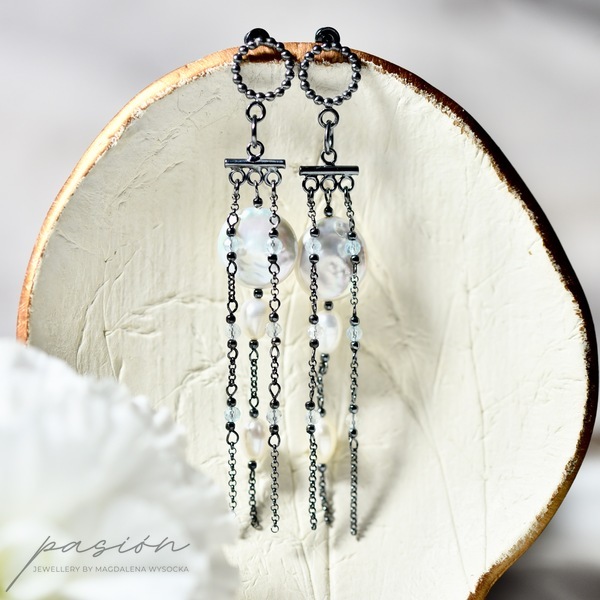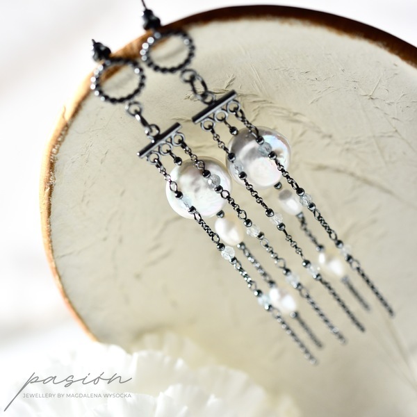 Monochromatyczne długie kolczyki na sztyftach wykonane od podstaw ręcznie ze srebra pierwszej próby 925, oksydowanego na kolor czarny.