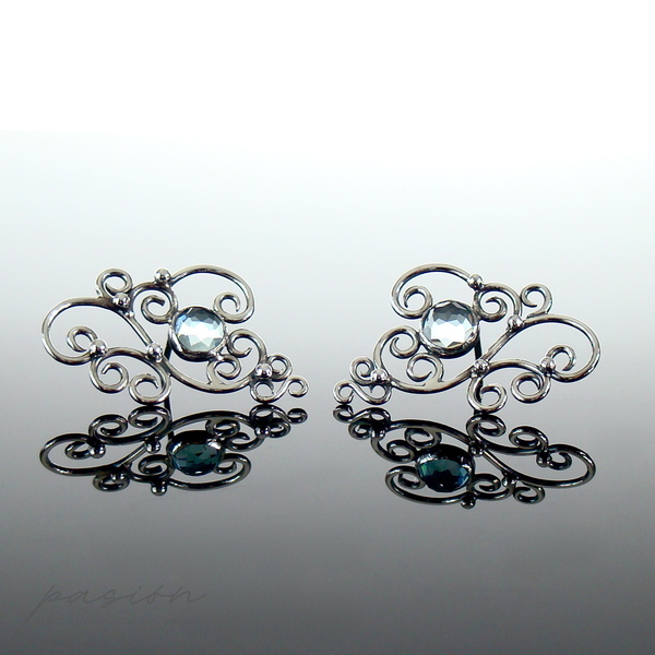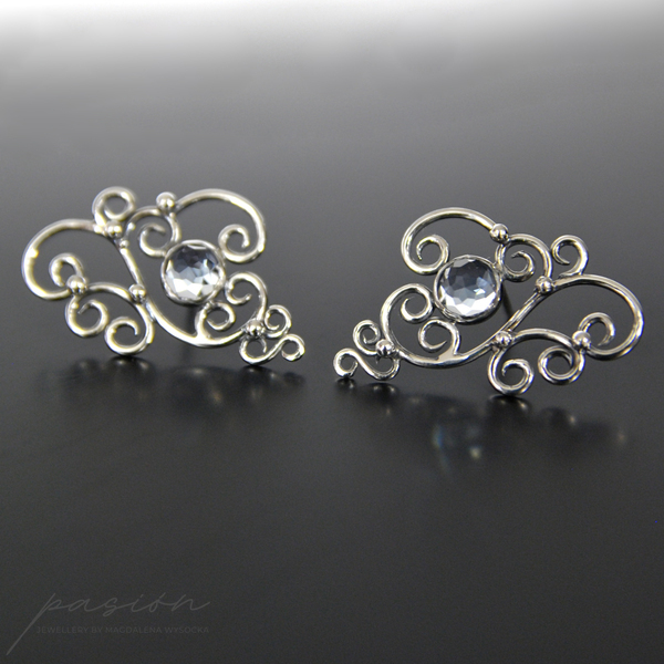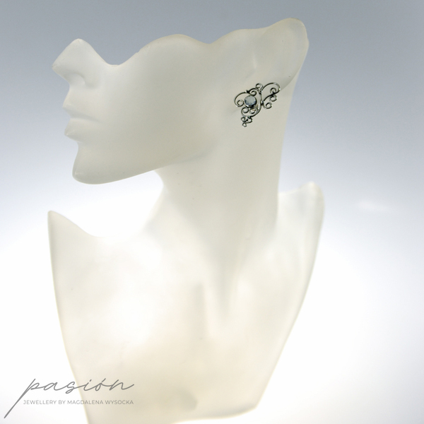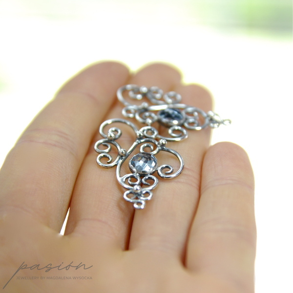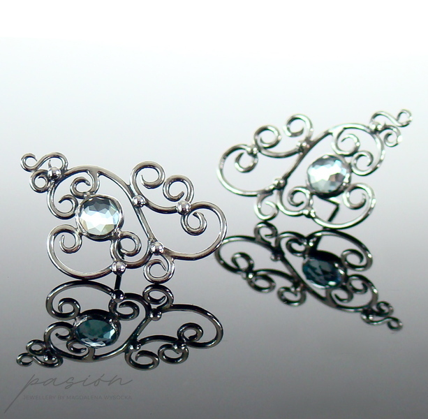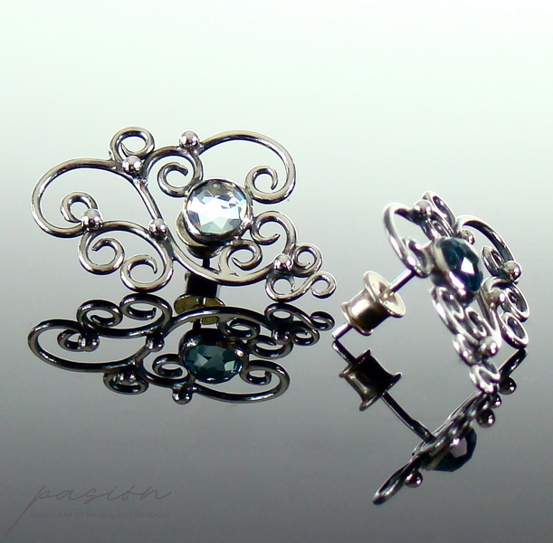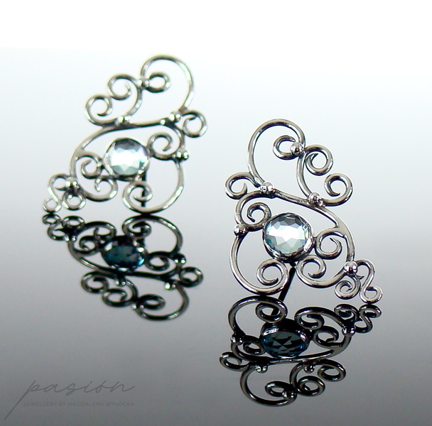 Sercem kolczyków jest oprawiony w srebro jasnoniebieski Topaz Sky Blue, otoczony florystyczną formą oksydowanego i wypolerowanego na wysoki połyski srebra. Topaz zmienia barwę w zależności od światła, ubioru i pogody :)