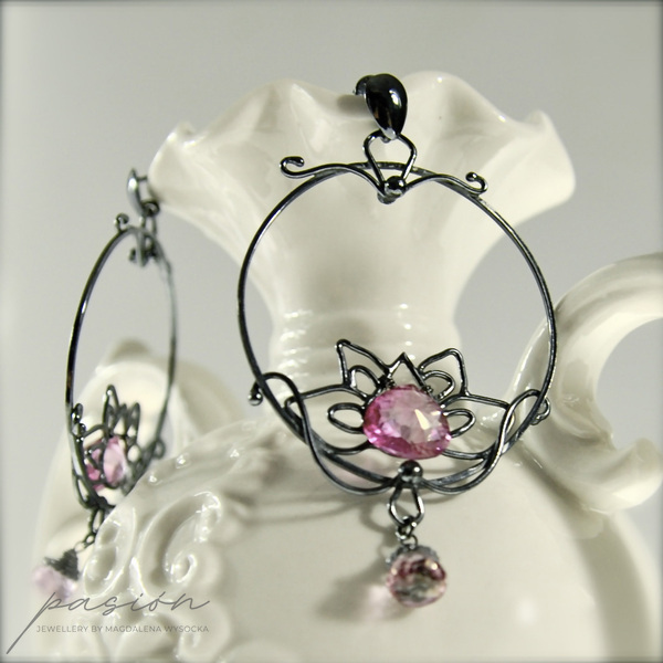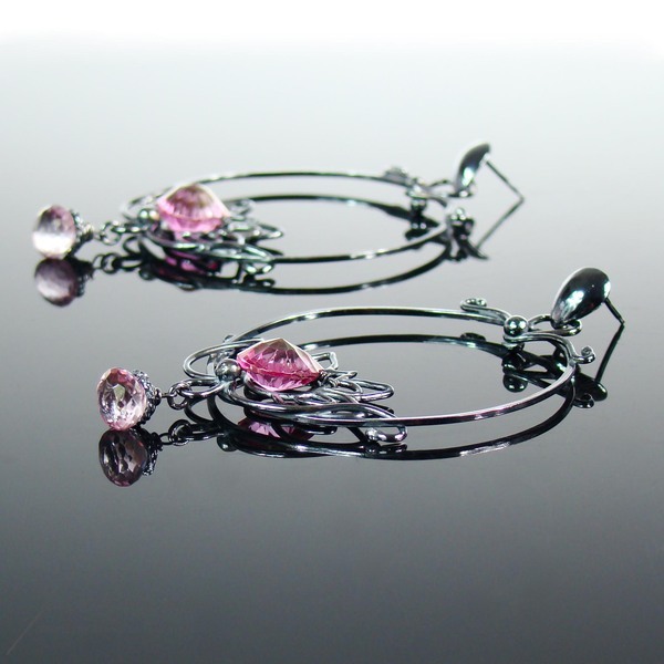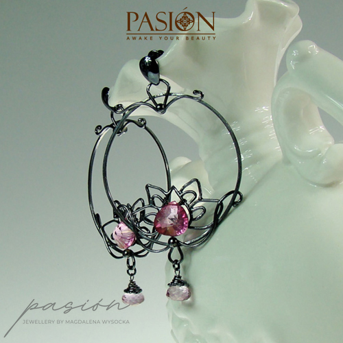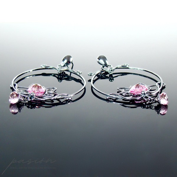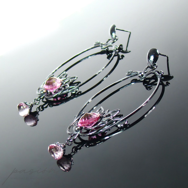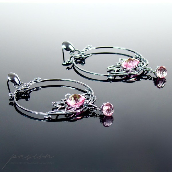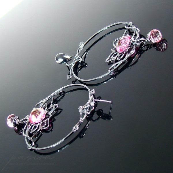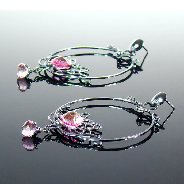 Fasetowany na kształt serca najczystszy, mistyczny różowy Topaz, imituje płatki lotosu i dodaje kolczykom niezwykłego blasku. W dolnej części lotosu zawisły drobne mikrofasetowane brioletki różowego Topazu.