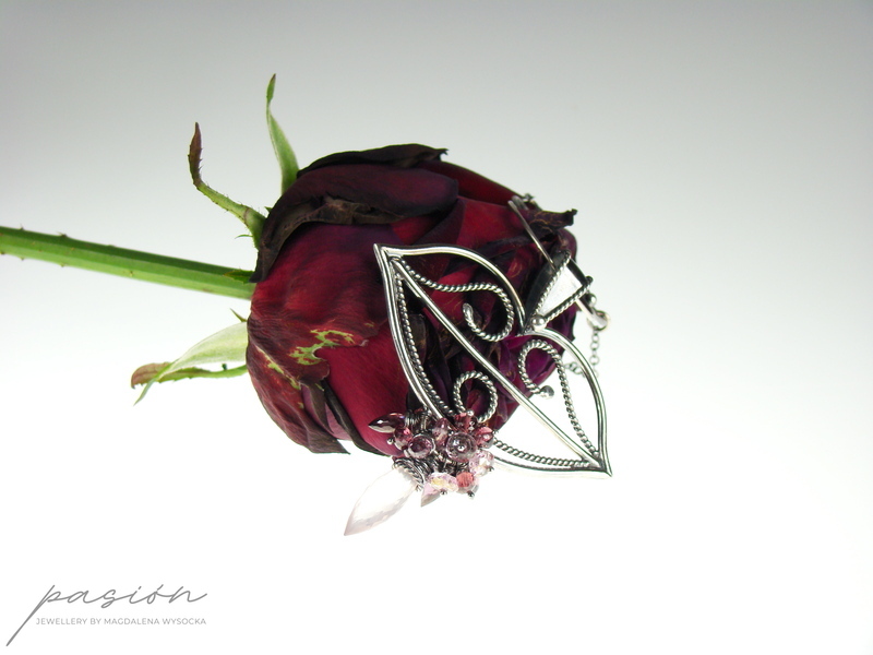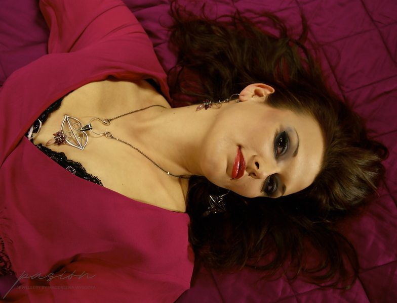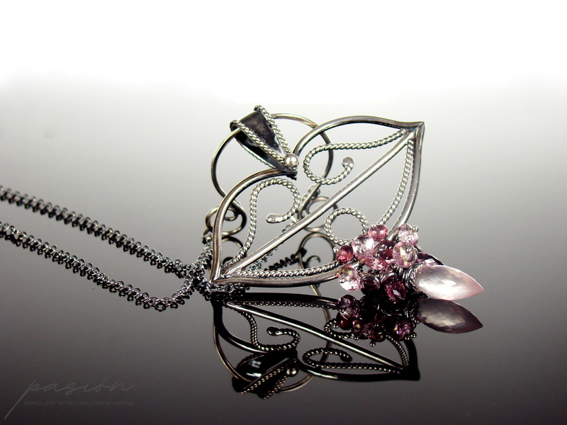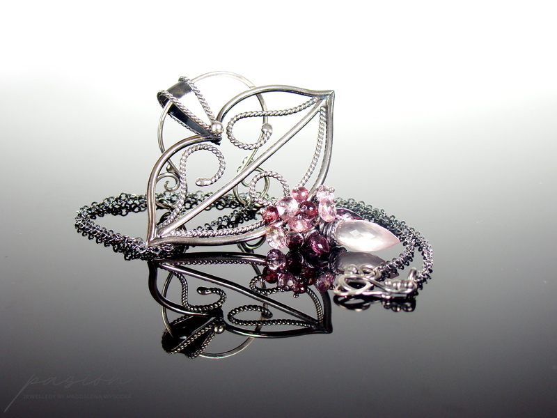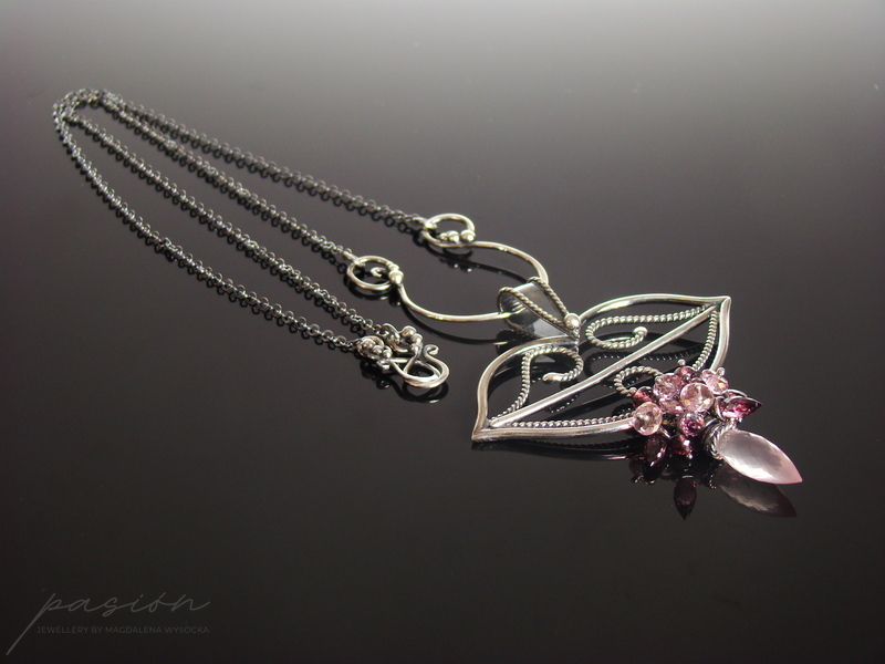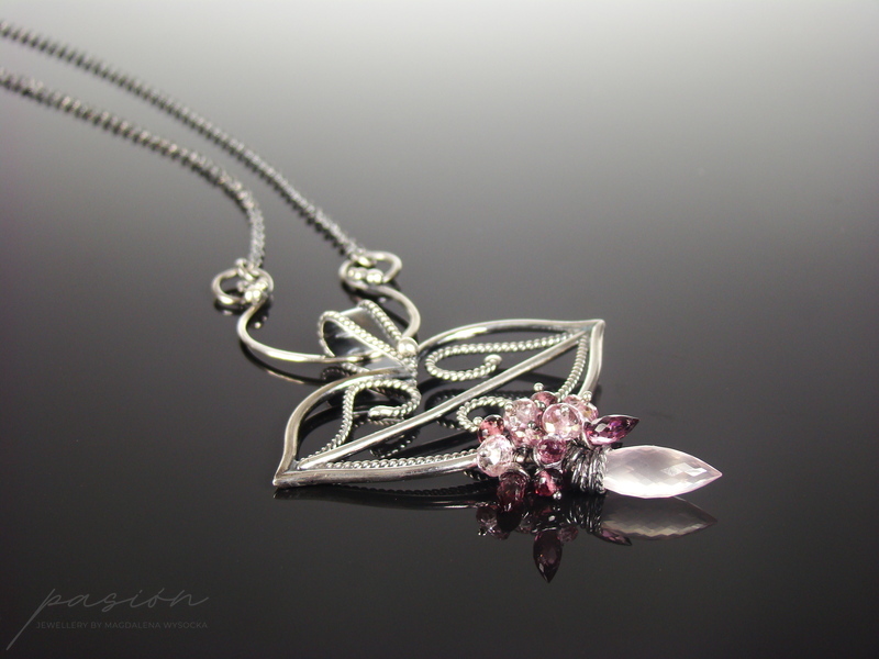 Naszyjnik w kształcie namiętnych kobiecych ust o różanej barwie, wykonany ze Srebra próby 925. Feria kamieni szlachetnych: przepiękna markiza Różowego Kwarcu, mistyczne Różowe Topazy oraz Rodolity, imituje płatki dojrzałego kwiatu róży. Te różane usta zawisły na ręcznie wykonanej, oryginalnej zawieszce i delikatnym srebrnym łańcuszku zakończonym zapięciem, również ręcznie wykonanym. Całość pracy pachnie subtelnym wyrafinowaniem.