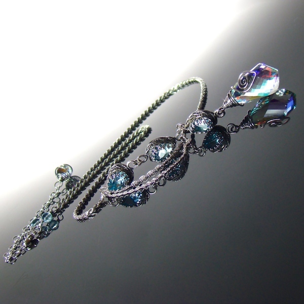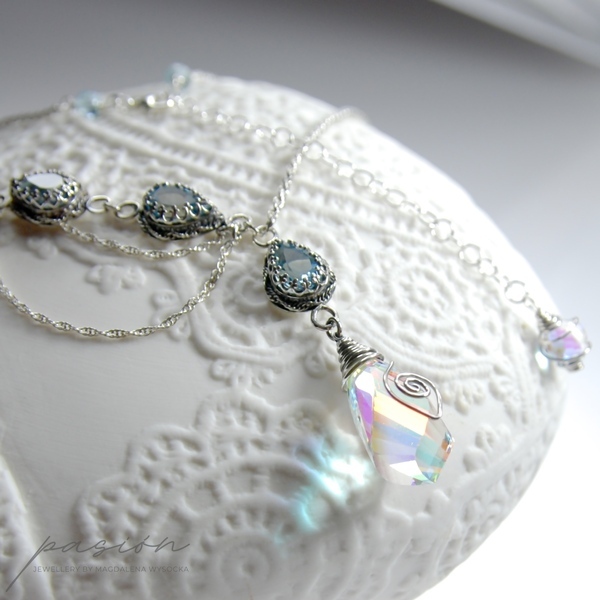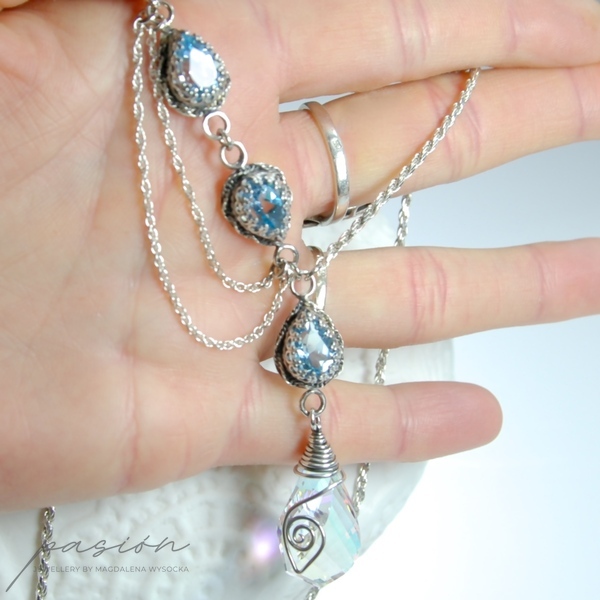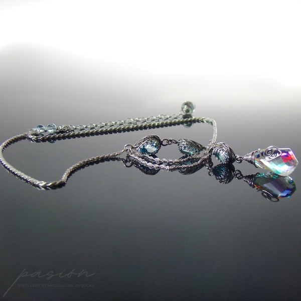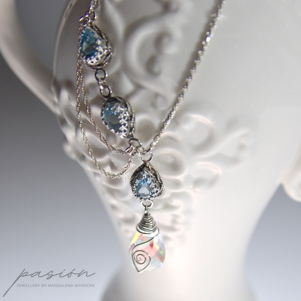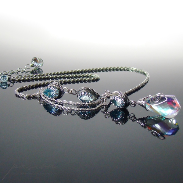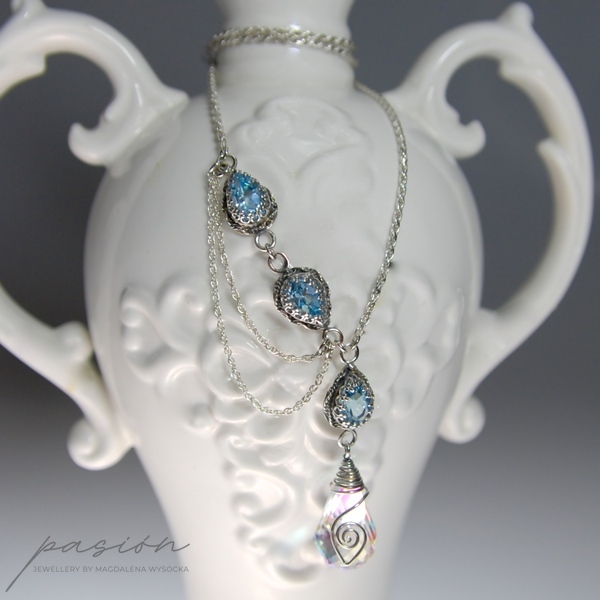 Naszyjnik zbudowany jest z Topazów Sky Blue w kształcie kropli otoczonych srebrną koroną oraz ognistą brioletką Kwarcu tęczowego w kształcie „spirali”, mieniącą się w zależności od światła ognisto-tęczowymi kolorami, wśród których dominuje pomarańcz, żółć i błękit. Na zakończeniu łańcuszka przedłużającego zawisła fasetowana brioletka Kwarcu tęczowego w kształcie cebulki, otoczona srebrną spiralką.