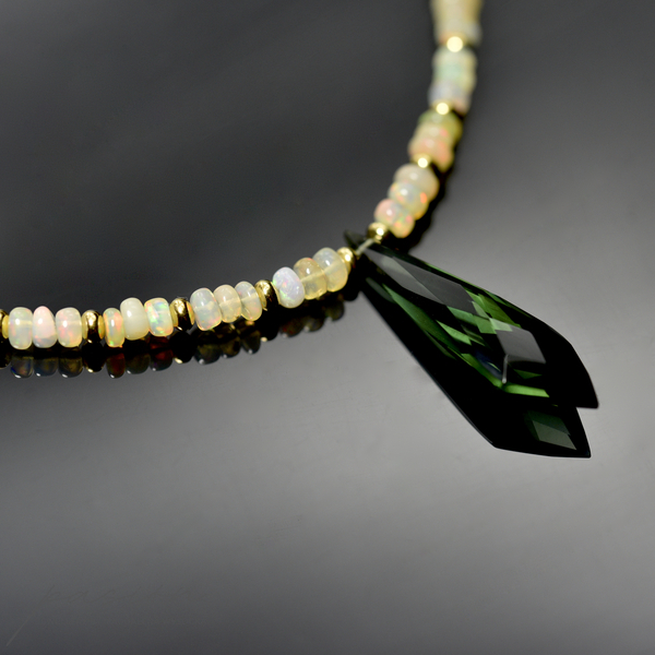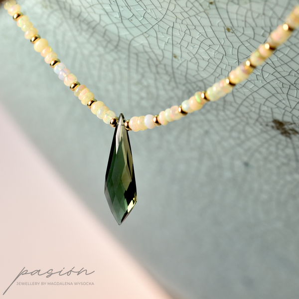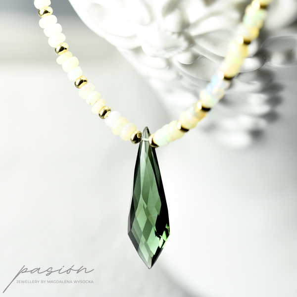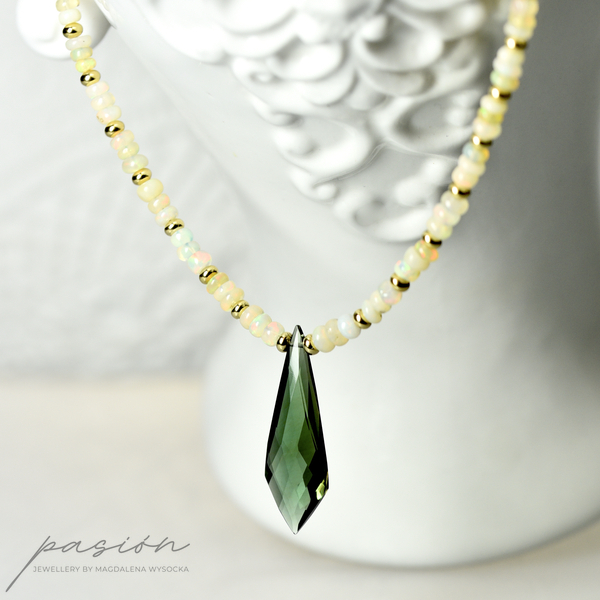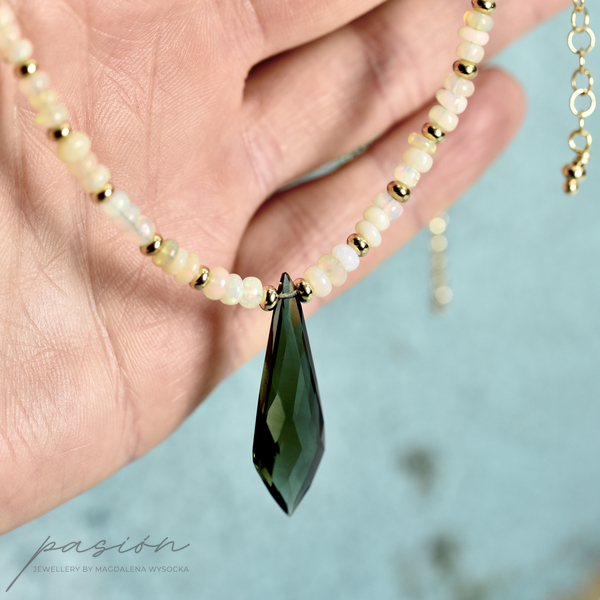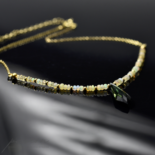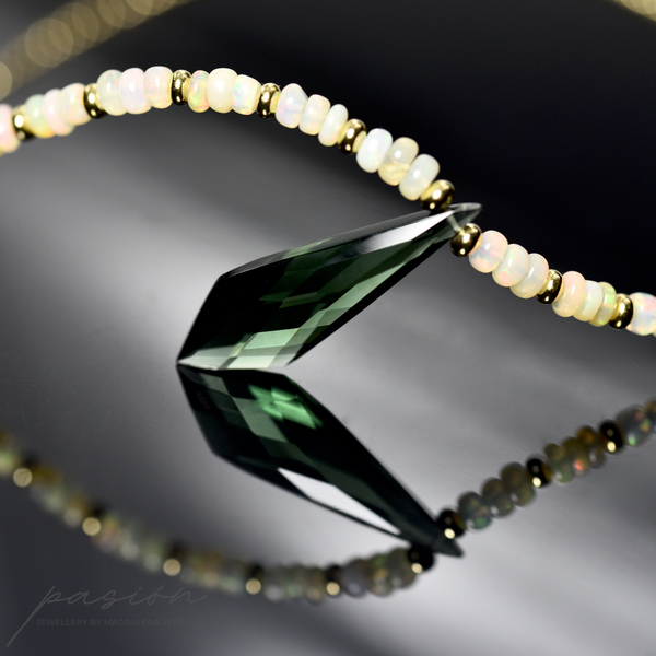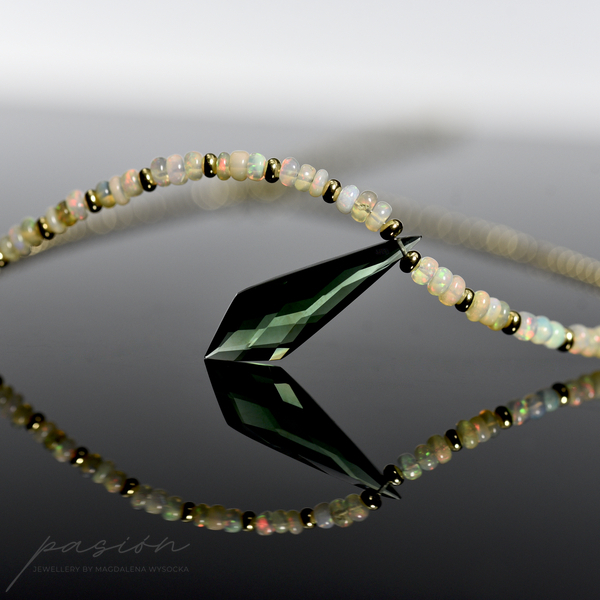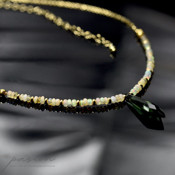 Naszyjnik został ozdobiony brioletką oryginalnie szlifowanego zielonego Ametystu i Opalami welo pełnymi złocistej opalizacji.