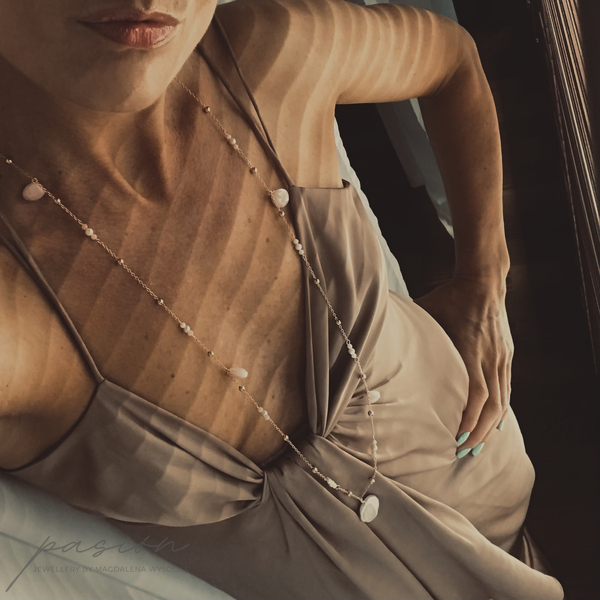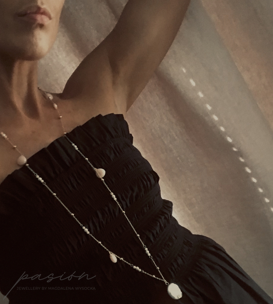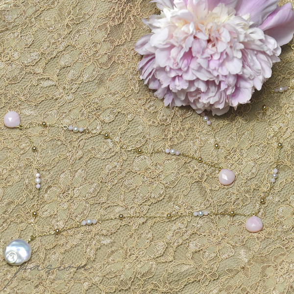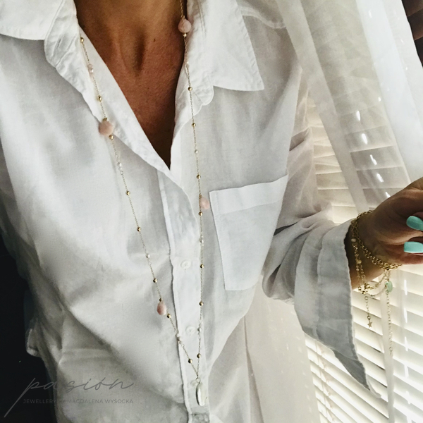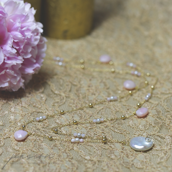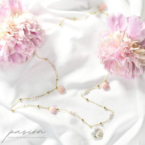 Długi, pachnący peoniami, przywołujący czułość i błogostan - złocony naszyjnik z naturalnymi Perłami i Opalami peruwiańskimi, idealny do każdej letniej stylizacji.
