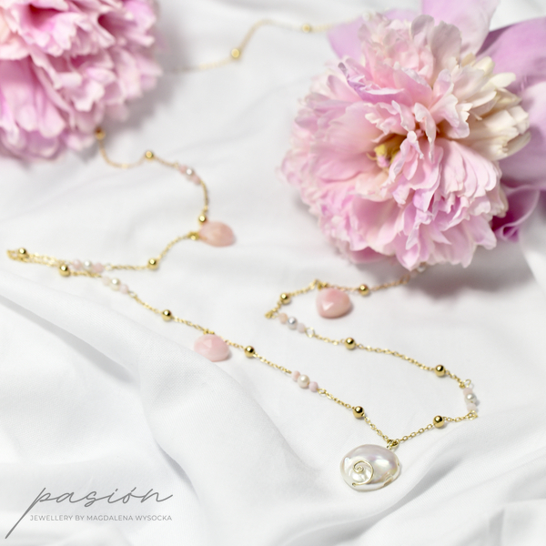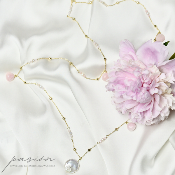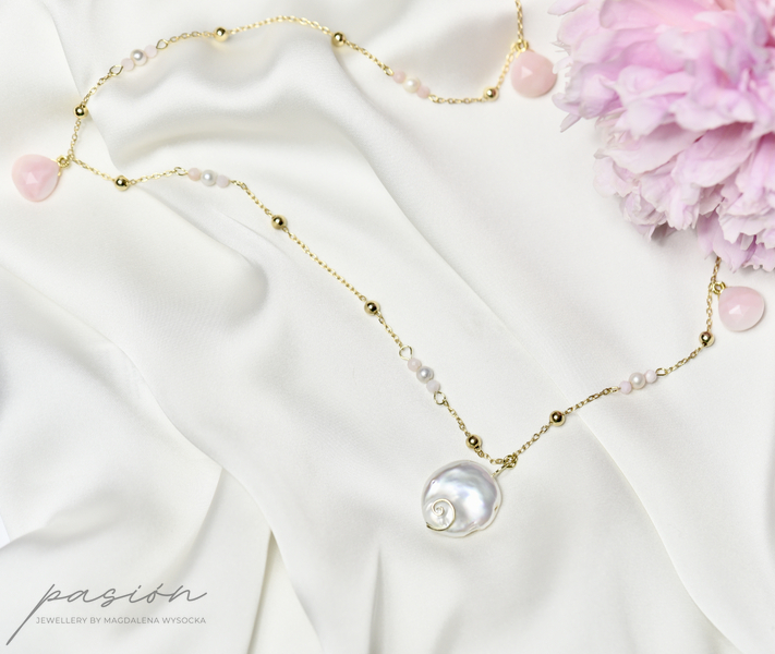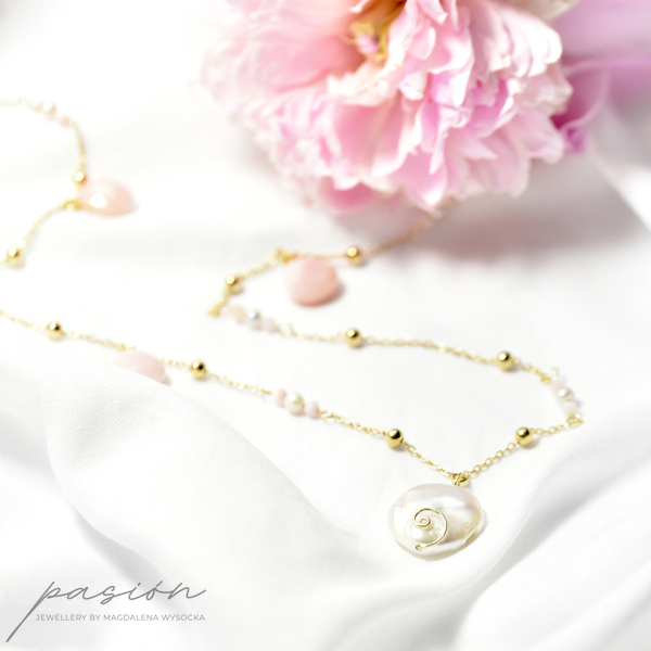 Na srebrnym, solidnym łańcuszku złocnym 24 ct złotem ozdobionym 4mm złoconymi kulami, zawisły naturlane perły przeplatane różowymi, fasetowanymi Opalami peruwiańskimi w niesamowitym, pastelowm odcieniu przywołującym czuły dotyk. Centrum naszyjnika stanowi monetka płaskiej sporej Perły o niepowtarzalnej formie.