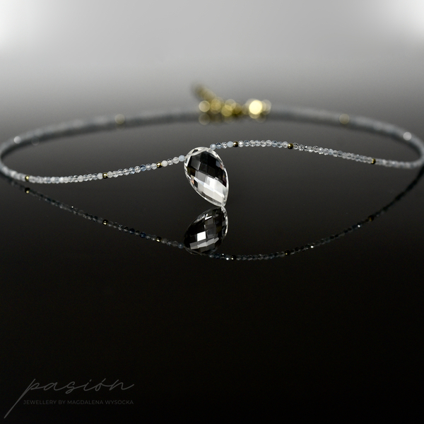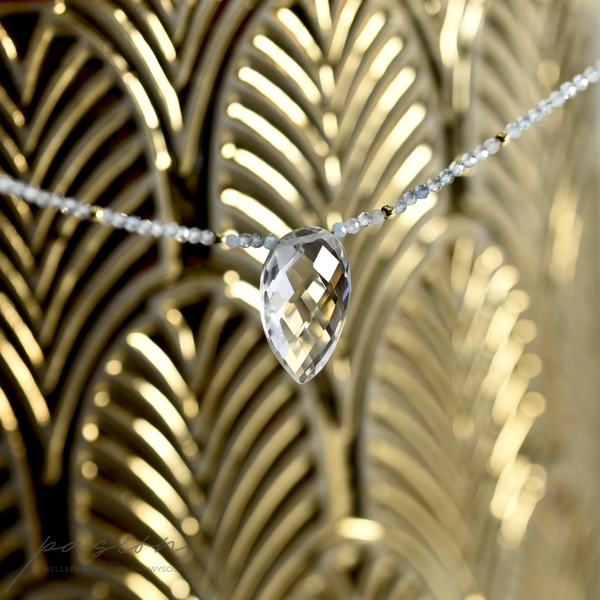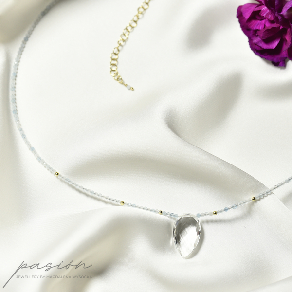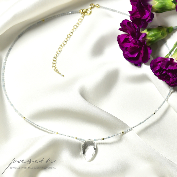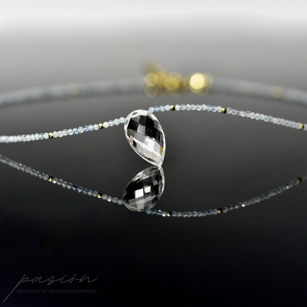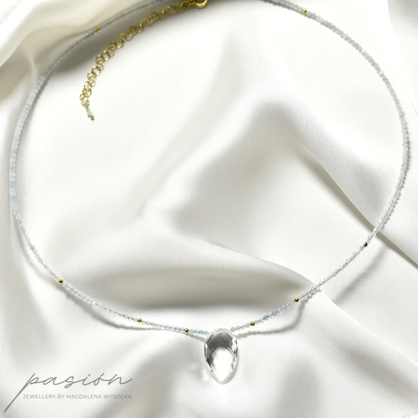 Krótki naszyjnik wykonany ręcznie z mikrofasetowanych kul Akwamarynów w wielu odcieniach błękitu, ozdobiony brioletką Kryształu górskiego o niezwykłym blasku.