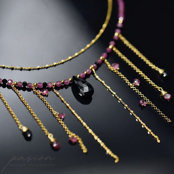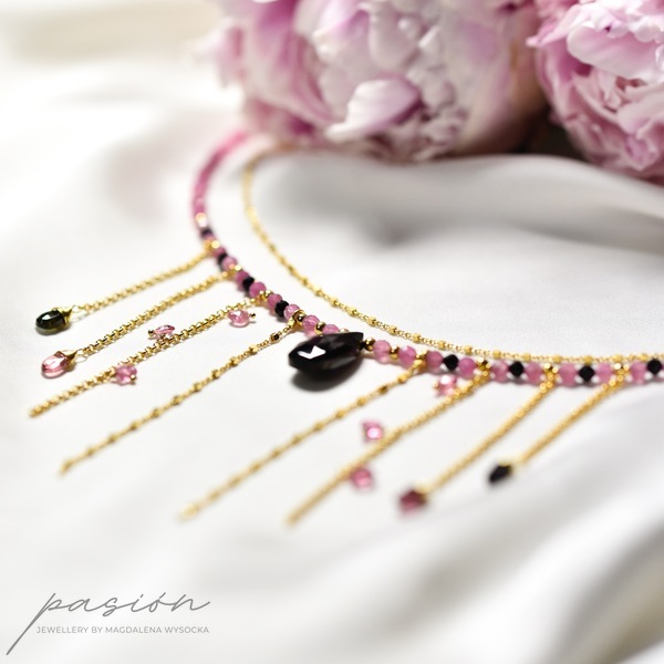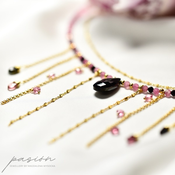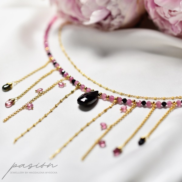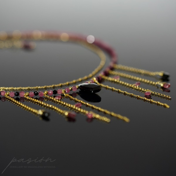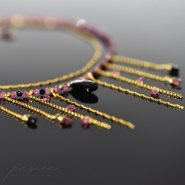 Złocony naszyjnik (srebro złocone 24ct złotem) z naturalnymi czarnymi i różowym Turmalinami w otoczeniu złota, stanowiący oryginalny dodatek do wieczorowych i codziennych kreacji.
