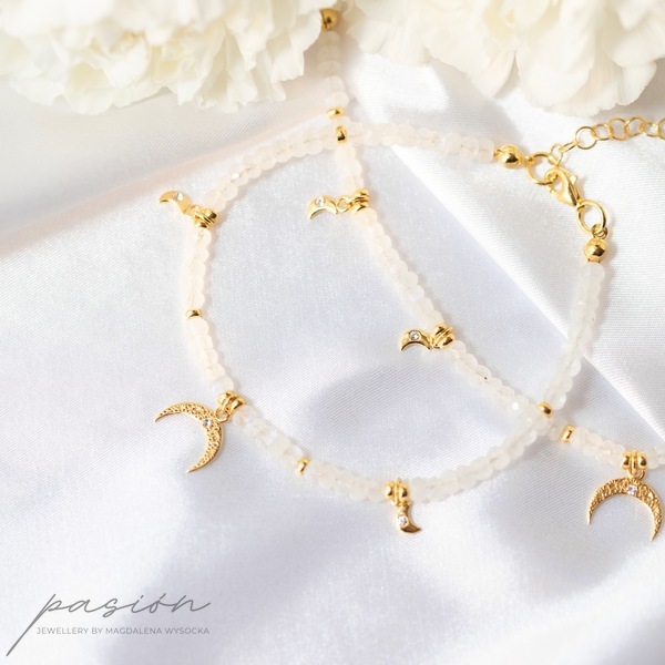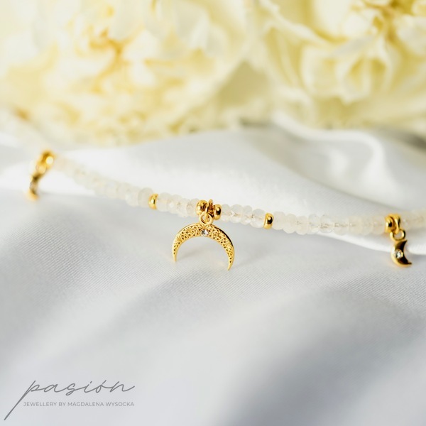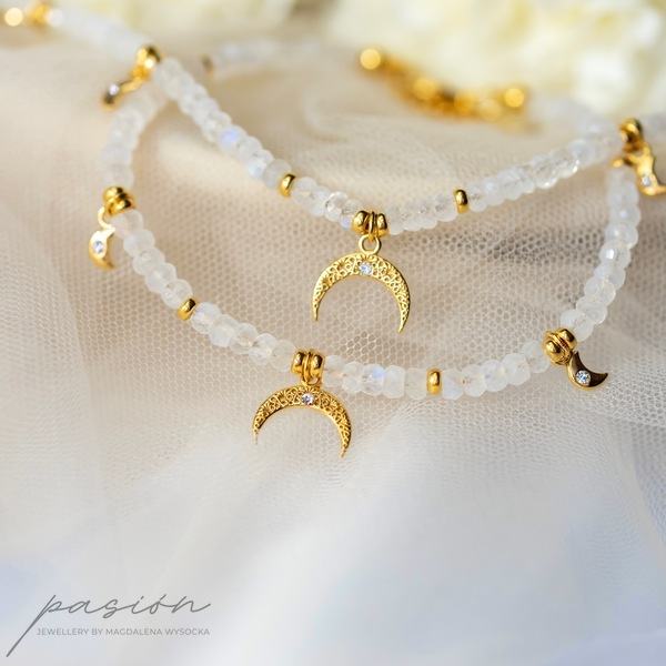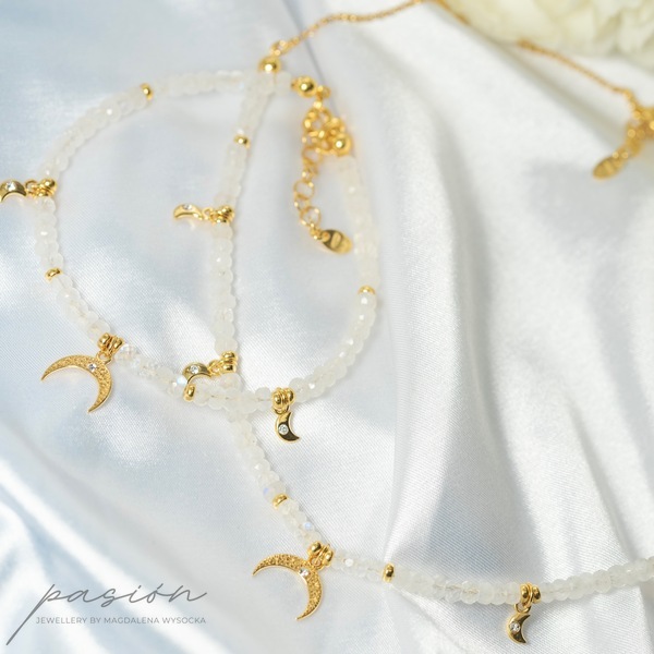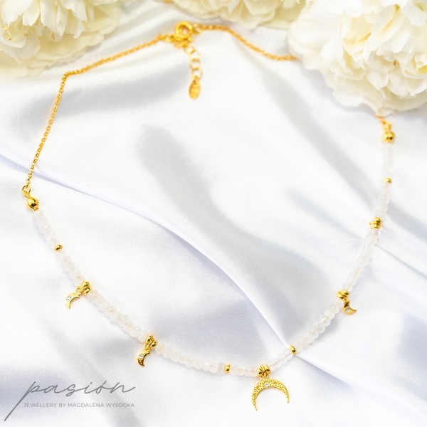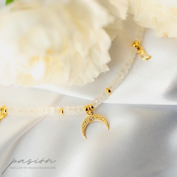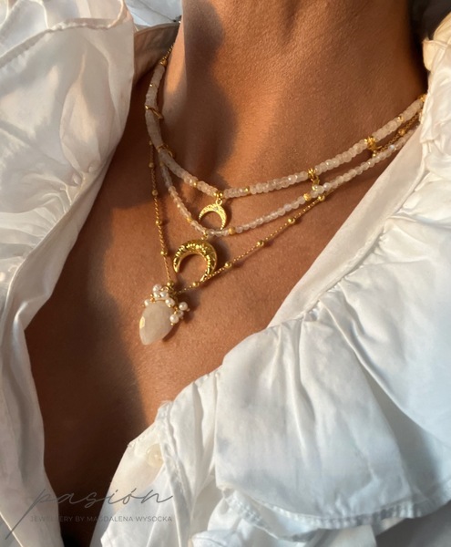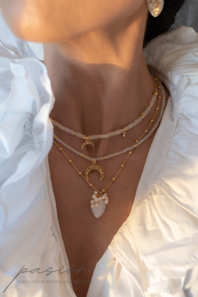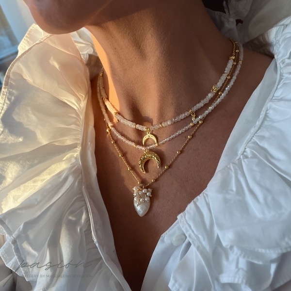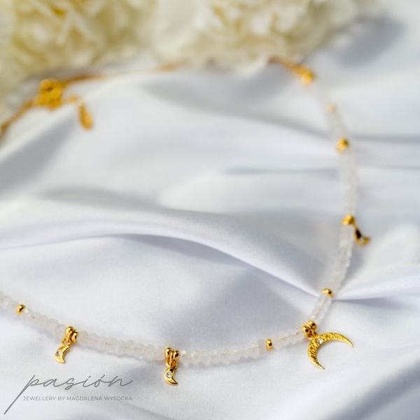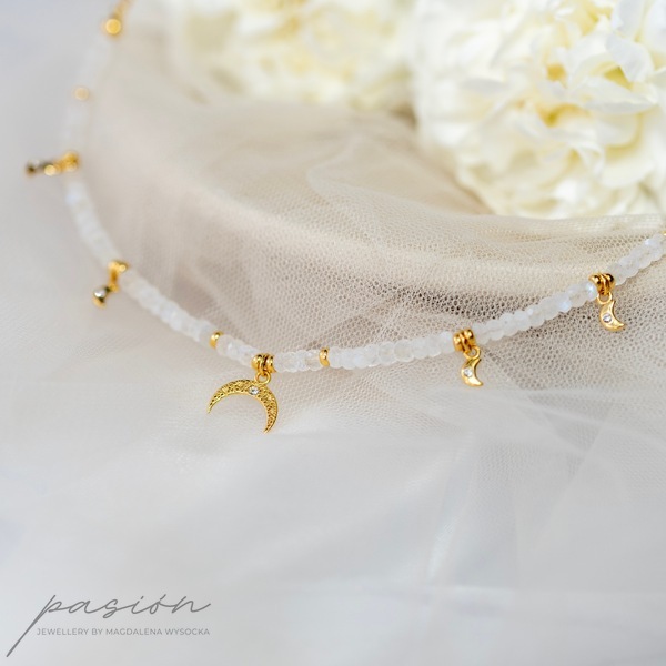 Centrum naszyjnika stanowi złoty półksiężyc z kryształkiem ozdobiony ażurowym wzorem w otoczeniu sznura mikrofasetowanych oponek Kamieni Księżycowych oraz malutkich półksiężyców z kryształkiem Preciosa. Sznur kamieni księżycowych zakończony jest złoconym łańcuszkiem.