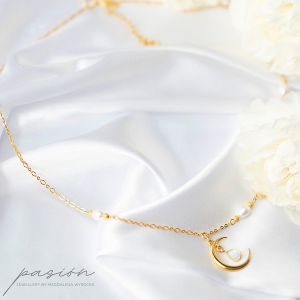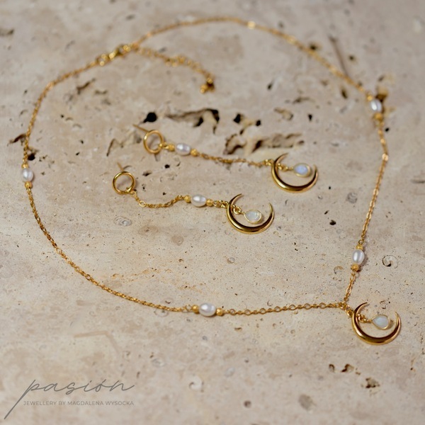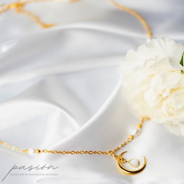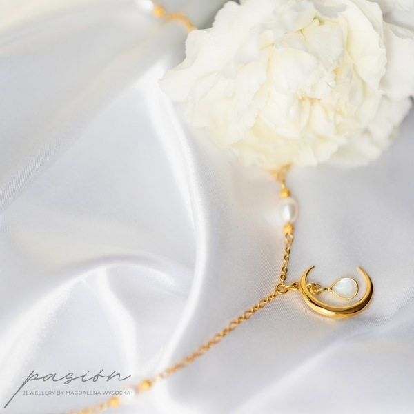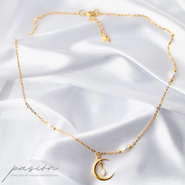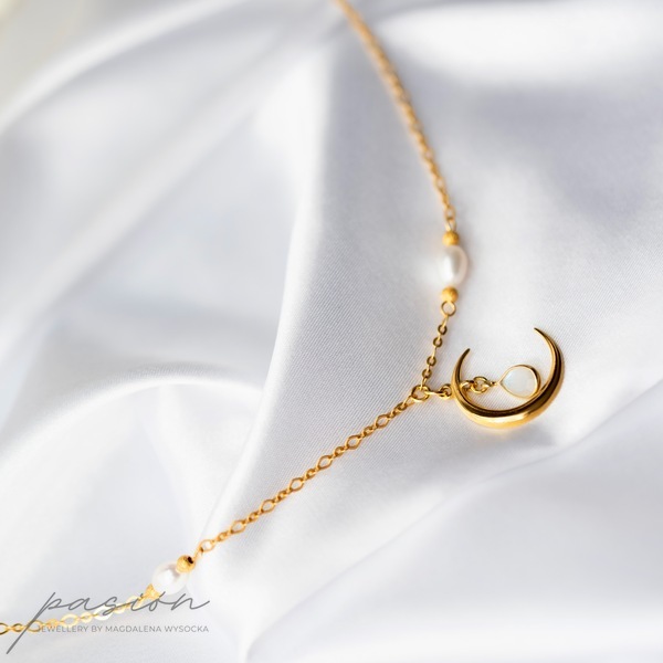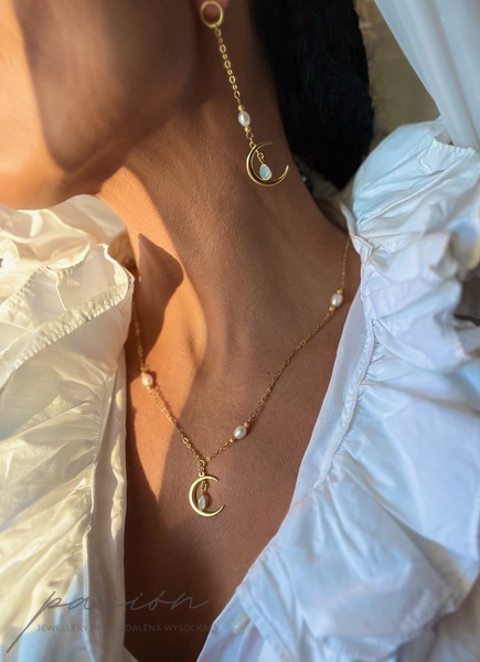 Centrum naszyjnika stanowi złoty pionowy półksiężyc oraz oprawiona brioletka Kamienia Księżycowego o niebiesko-zielonej adularyzacji (poświata, która pojawia się w zależności od kąta padania światła) zawieszone na łańcuszku ozdobionym asymetrycznie naturalnymi Perełkami. Całość tworzy lekką, romantyczną kompozycję.