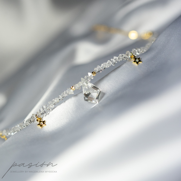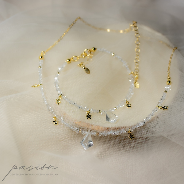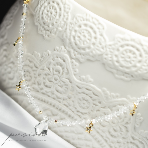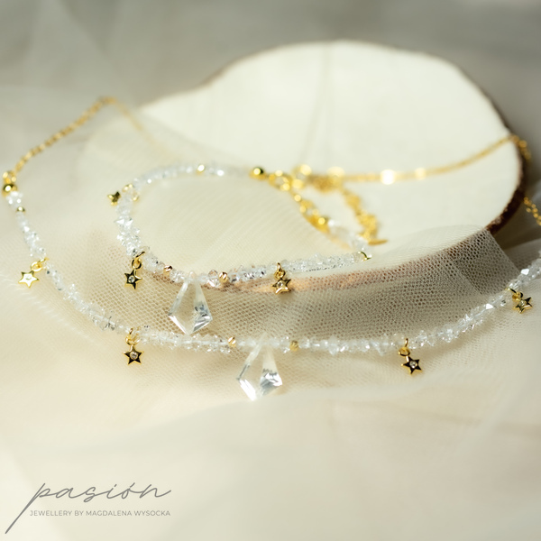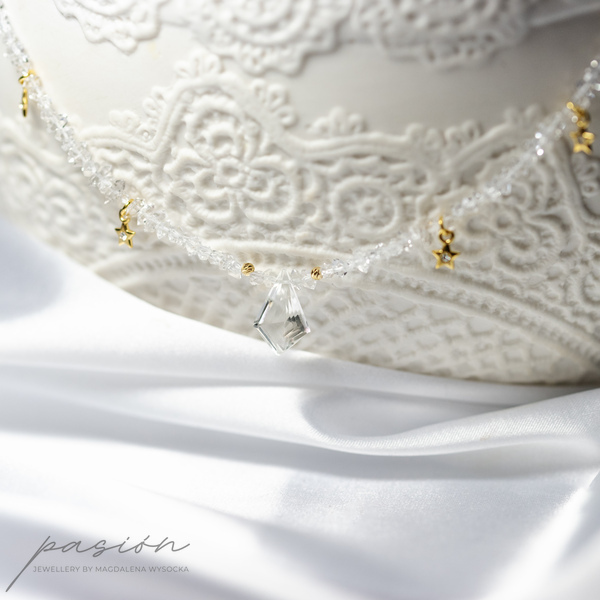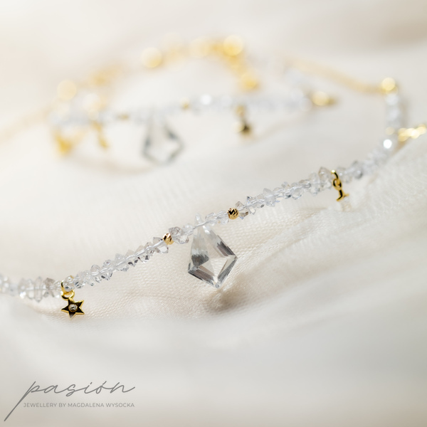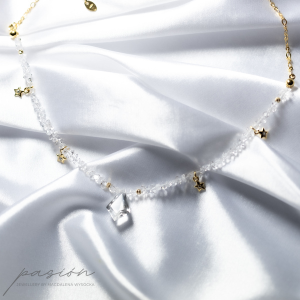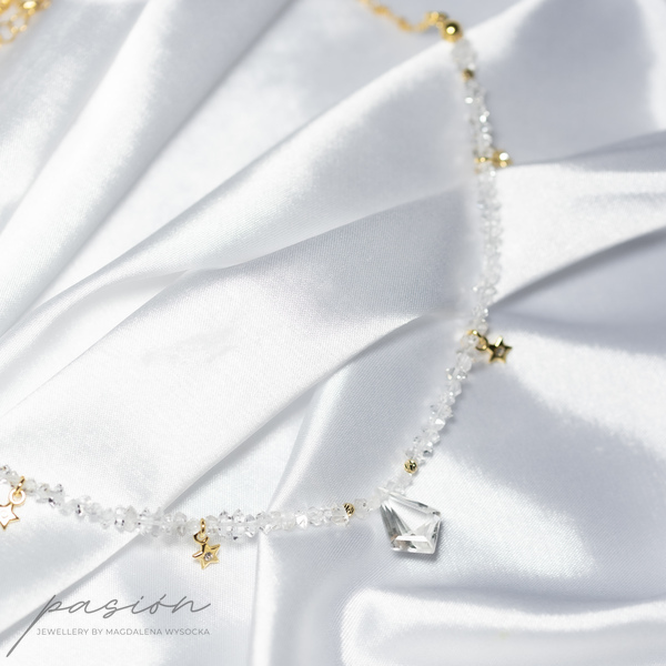 Centrum naszyjnika stanowi Kryształ górski oszlifowany na kształt latawca w otoczeniu sznura surowych kryształów górskich imitujących diamenty Herkimer oraz malutkich gwiazdek z kryształkiem Preciosa. Sznur surowych Kryształów zakończony jest złoconym łańcuszkiem.
