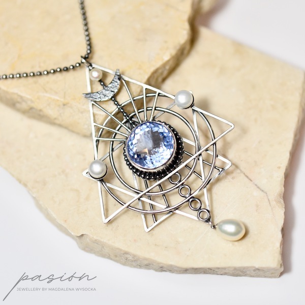 Okazały w formie i bogaty w symbolikę naszyjnik - wisior wykonany ręcznie ze srebra próby 925 oraz 999, oksydowanego miejscowo na ciemny kolor srebra, a miejscowo wypolerowanego na lustrzany połysk.