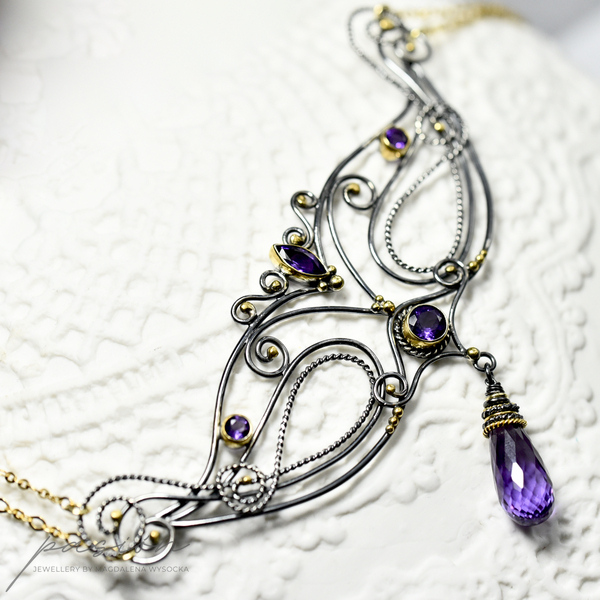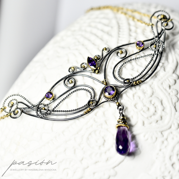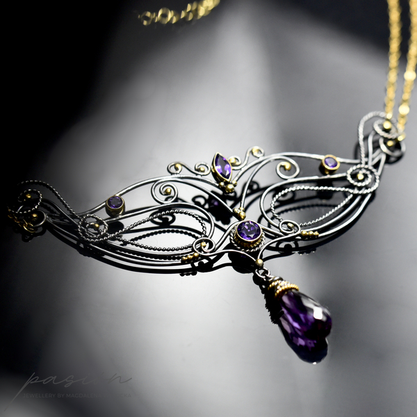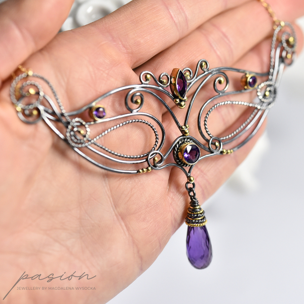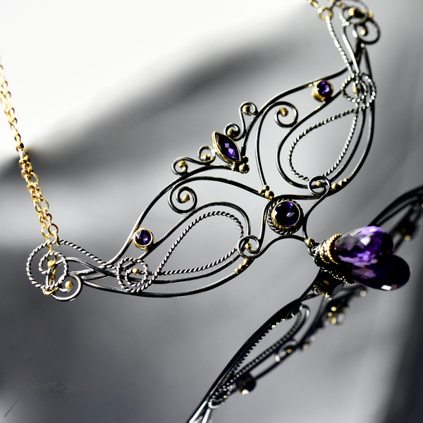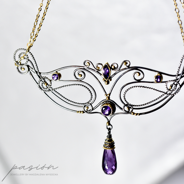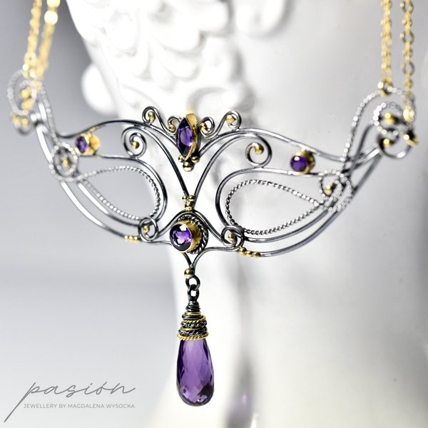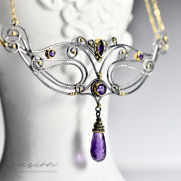 Inspirowany weneckimi maskami, elegancki krótki naszyjnik wykonany ręcznie ze srebra 925 złoconego czystym 24ct złotem, ozdobiony purpurowymi naturalnymi Ametystami. Efektowna, czarna maska została ozdobiona najczystszymi Ametystami: fasetowana 8ct briolettą oraz oprawionymi w złocone srebro fasetowanymi Ametystami w dwóch kształtach: markizy i koła.
