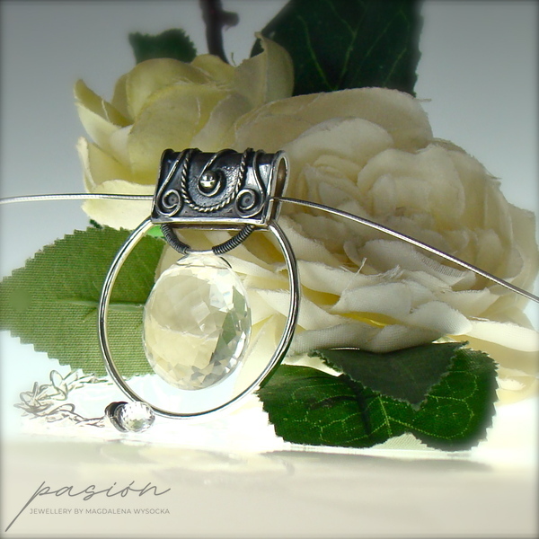 Sercem naszyjnika jest okazały, fasetowany indyjski Kryształ Górski o niesamowitym połysku i średnicy 22 mm, zawieszony na wytwornie zdobionej, oksydowanej kasetce. Dyskretna, ale równocześnie luksusowa zawieszka umieszczona została na srebrnej „żmijce” zakończonej łańcuszkiem przedłużającym naszyjnik o 10 cm. Na jego końcu subtelnie prezentuje się fasetowana brioleta najczystszego Górskiego Kryształu w kształcie markizy.