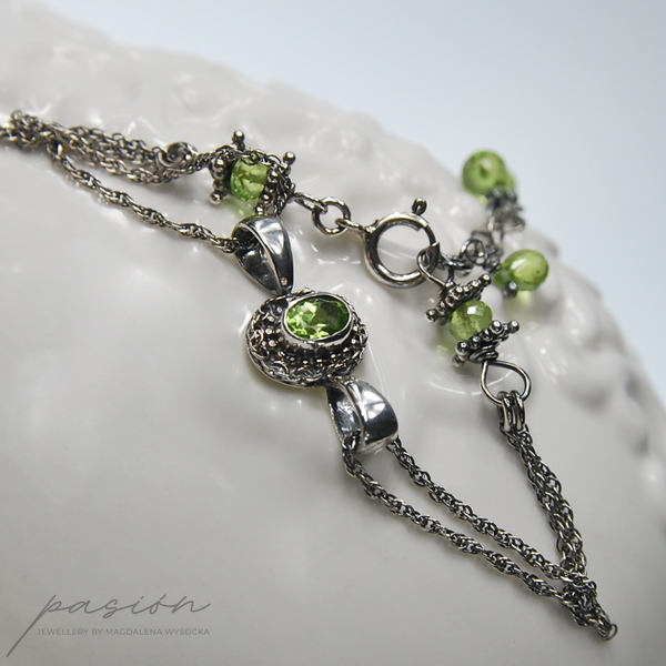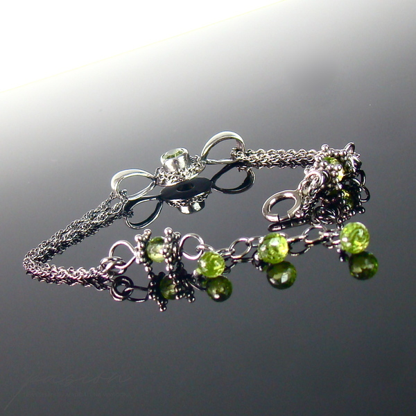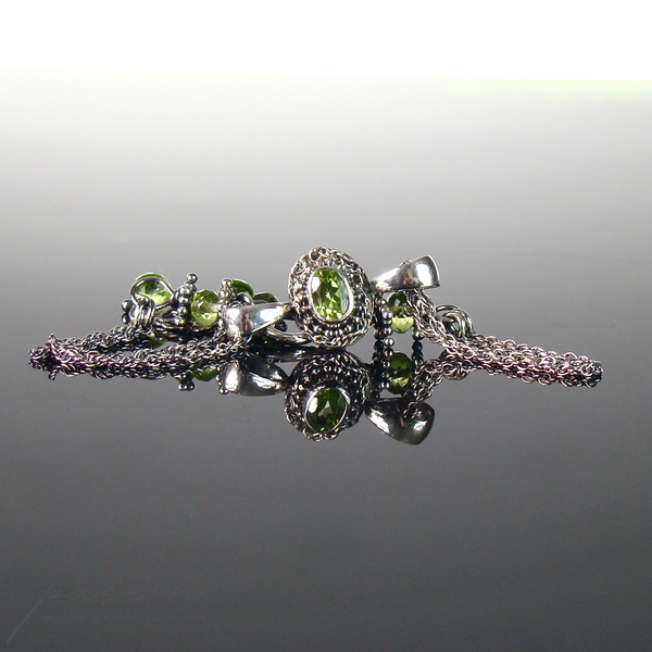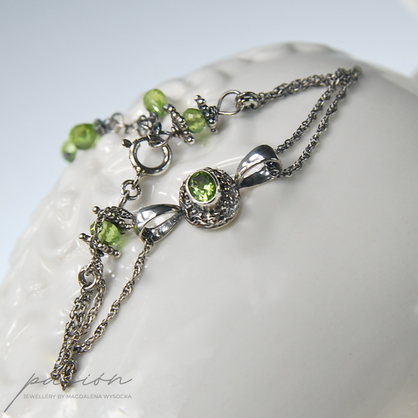Sercem bransoletki jest owalny Peridot o szlifie diamentowym. Na zakończeniach bransoletki oraz na łańcuszku przedłużającym zawisły także fasetowane oponki i brioletki Peridotów.