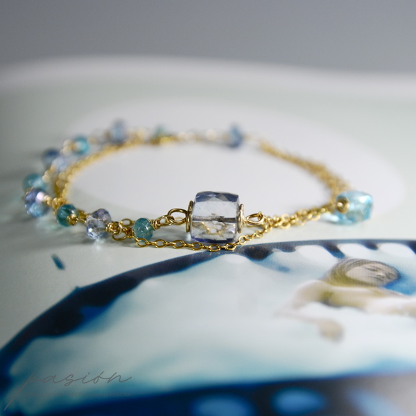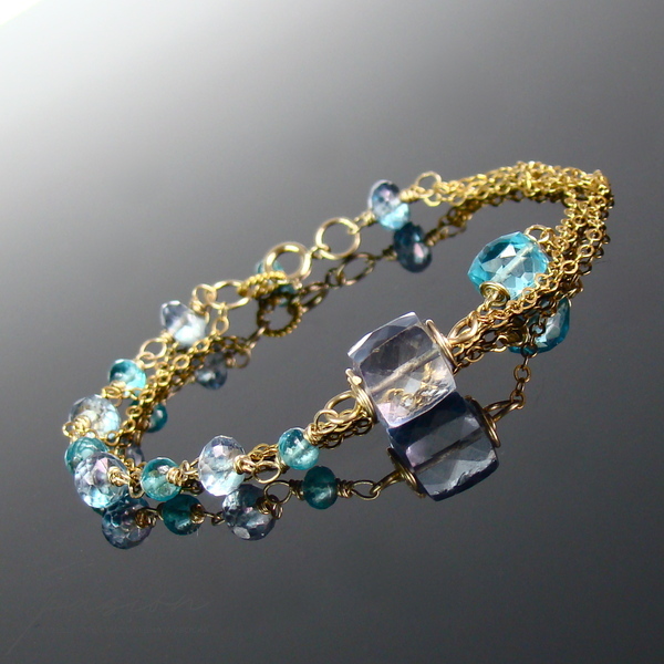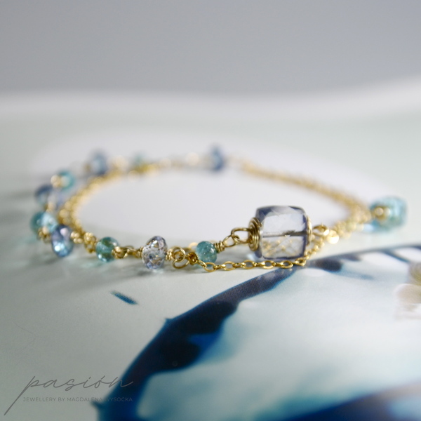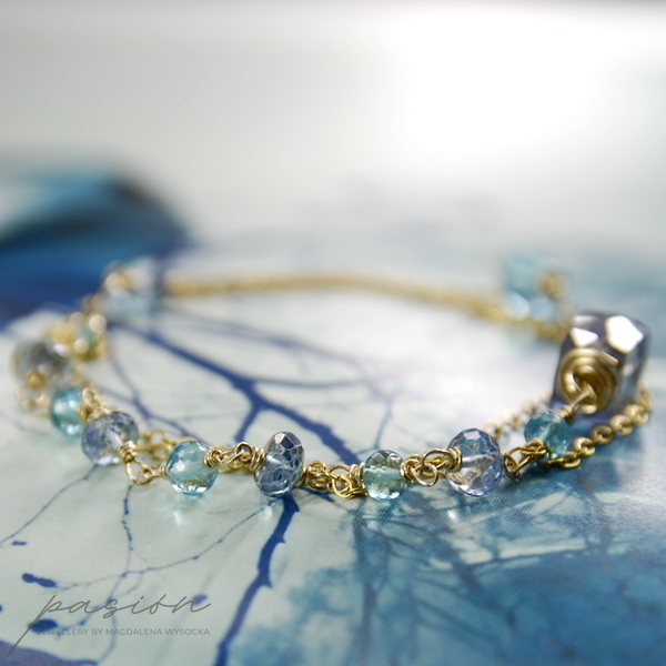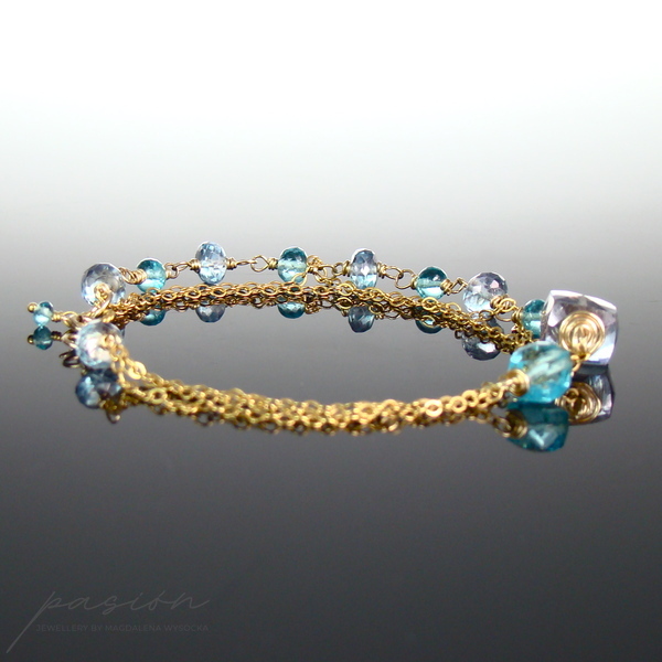 Bransoletka została ozdobiona fasetowanymi oponkami turkusowego Apatytu oraz niebieskiego, mistycznego Topazu. Dwie fasetowane kostki to niebieski Kwarc o tanzanitowym odcieniu oraz Topaz Swiss Blue w jaskrawym kolorze błękitu.