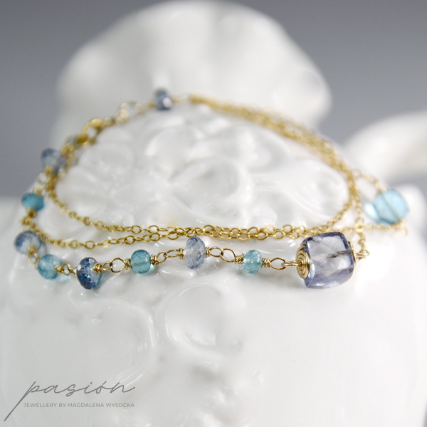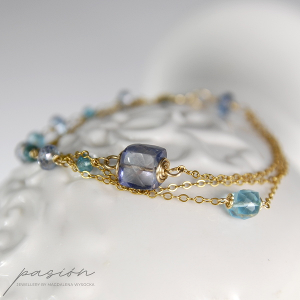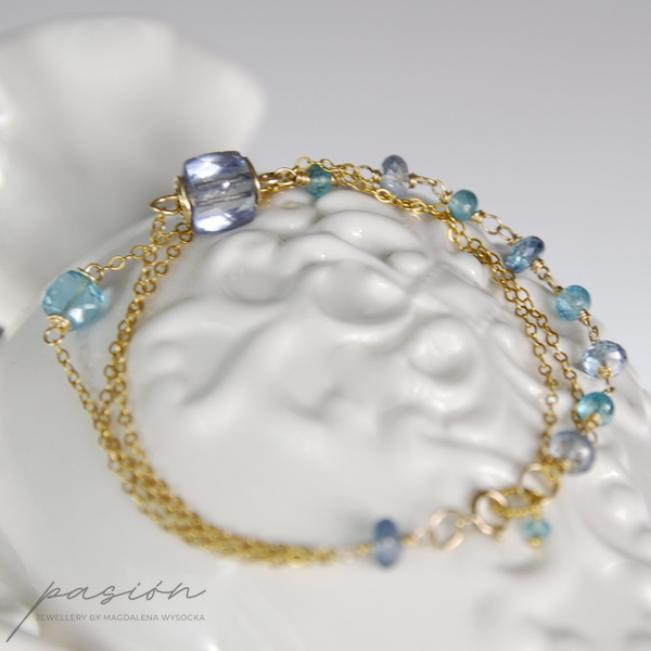 Nowoczesna w formie, emanująca intensywnymi kolorami turkusu i indygo - złota bransoletka z naturalnymi kamieniami wykonana ręcznie z trzech złotych łańcuszków ze stopu 14ct Gold Filled.