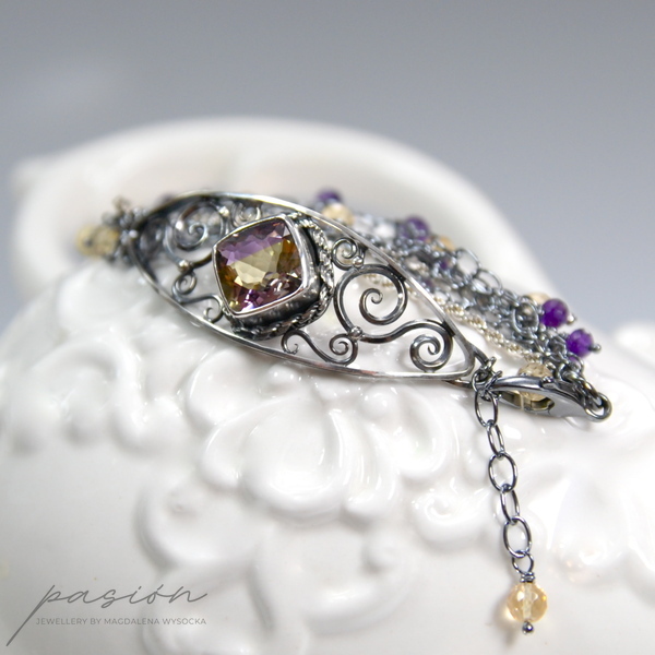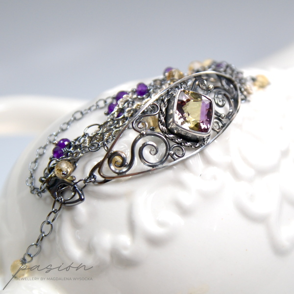Niezwykle kobieca bransoleta ozdobiona najwyższej jakości dwukolorowym Ametrynem w oryginalnym kształcie typu "cushion" oraz microfasetowanymi oponkami fioletowych Ametystów i kulami żółtych Cytrynów zawieszonych na wielu łańcuszkach.
