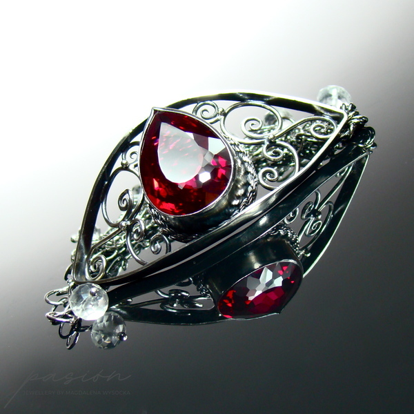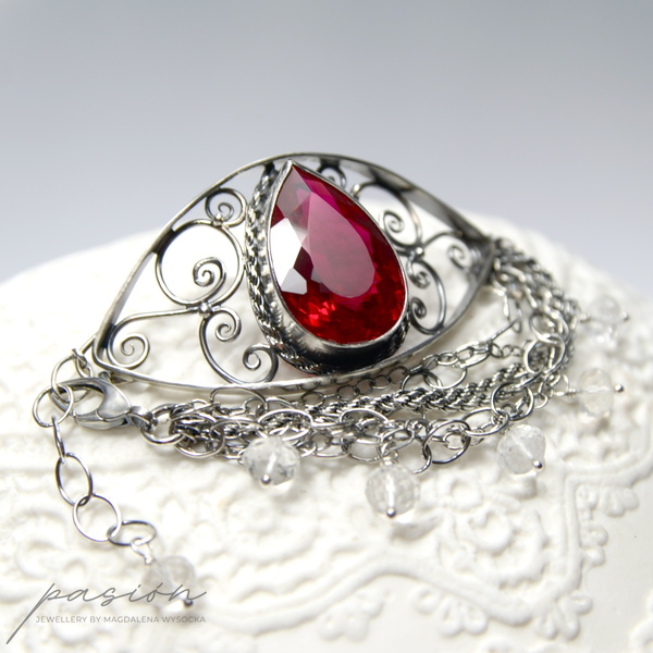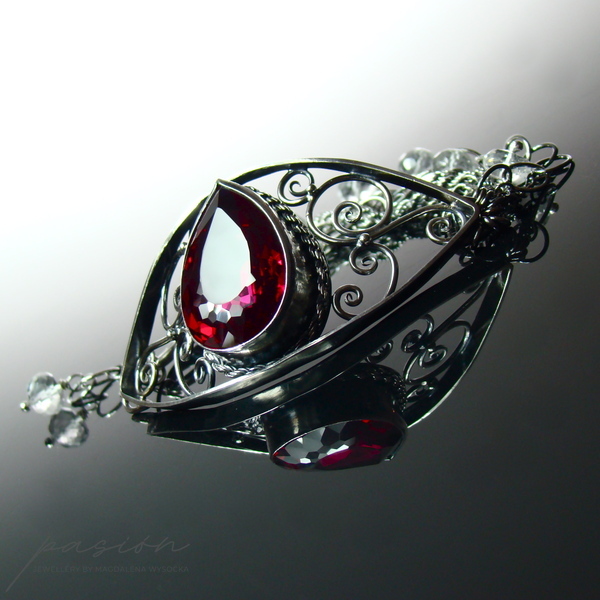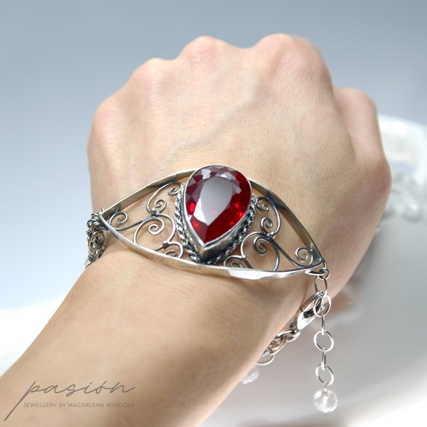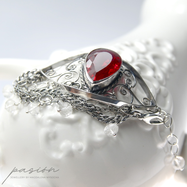 Sercem bransolety jest spektakularny czerwony Topaz o najwyższej jakości i niebywałym szlifie wydobywającym jego niespotykany blask. Topaz został oprawiony w srebro i otoczony srebrnymi zdobieniami w towarzystwie lśniących diamentowo białych Topazów zawieszonych na wielu łańcuszkach bransolety.