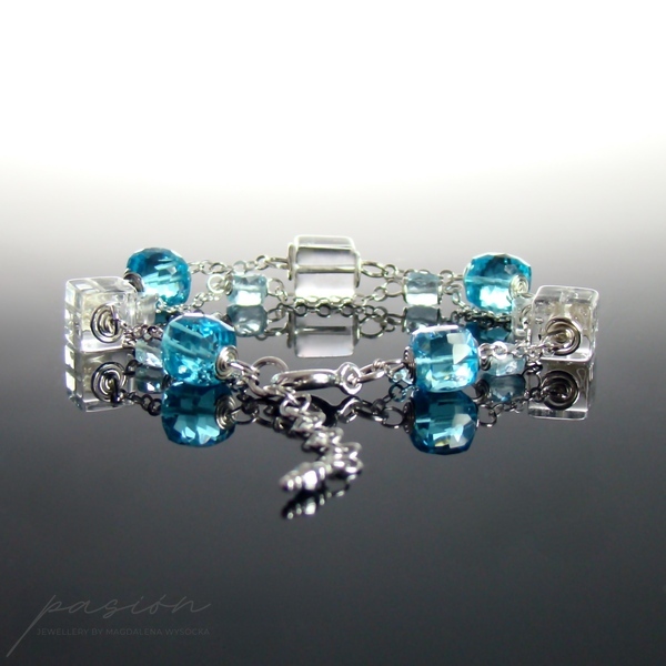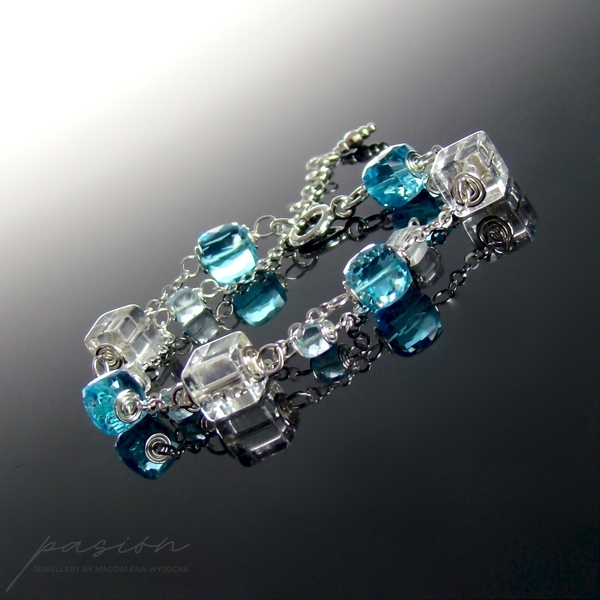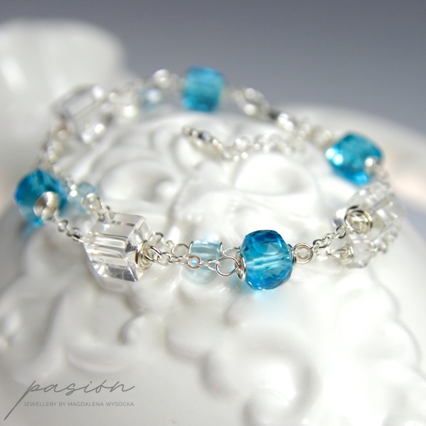 Bransoleta została ozdobiona różnej wielkości kostakami kilku rodzajów kamieni: Kryształów górskich, Topazów Sky Blue i Topazów Swiss Blue. W ten sposób całość tworzy acsetyczne, geometryczne formy doskonale prezentujące się na nadgarstku.