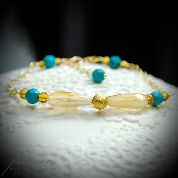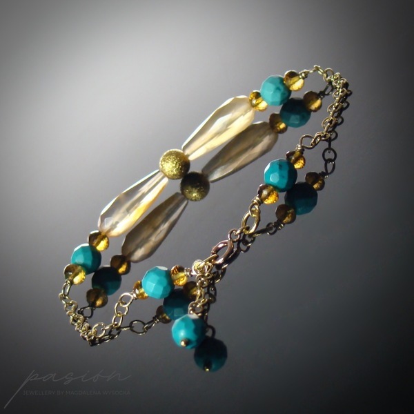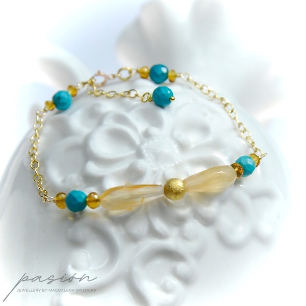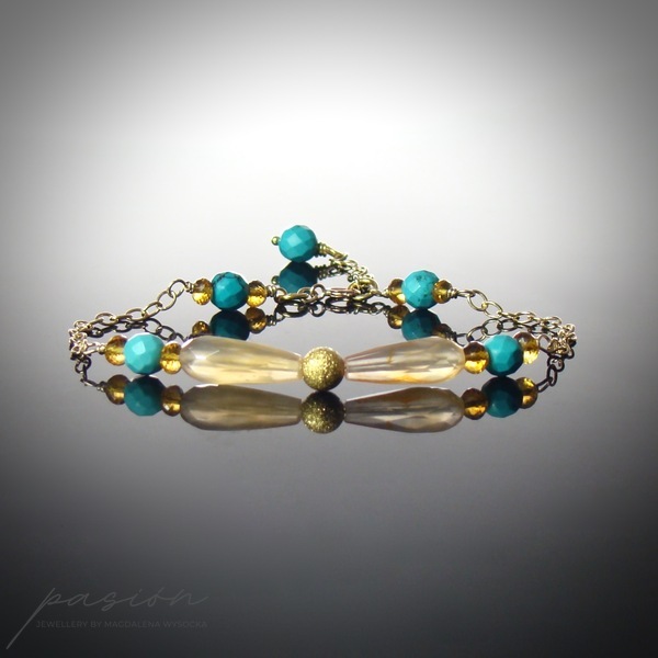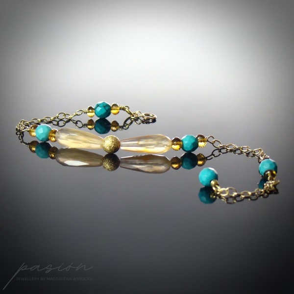 Bransoleta wykonana jest z mikrofasetowanych kamieni - brioletek brzoskwiniowego Kwarcu, oponek Cytrynów Madeira oraz naturalnego Turkusu.