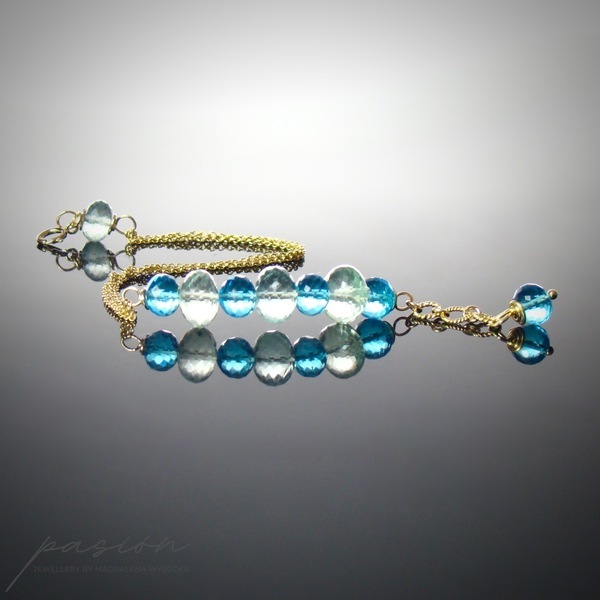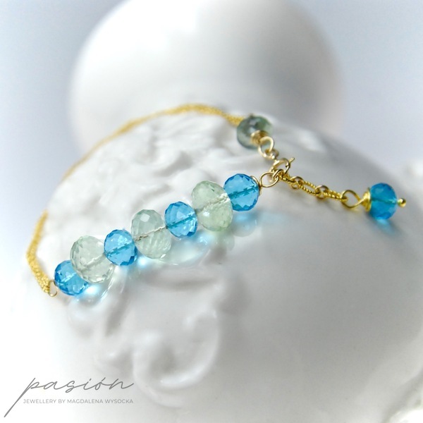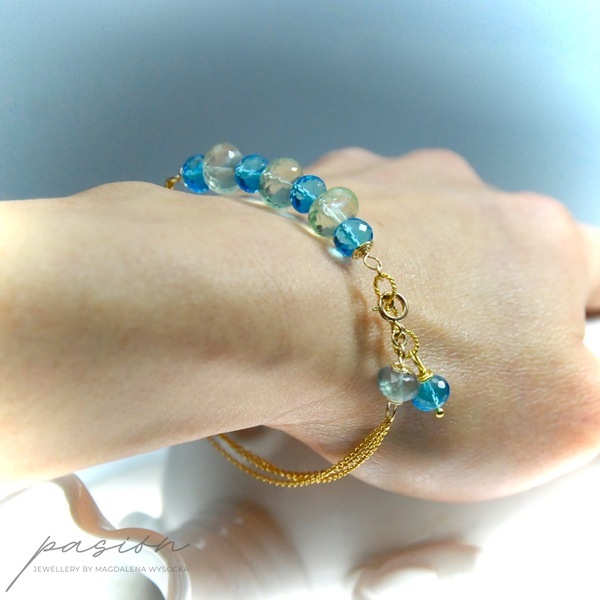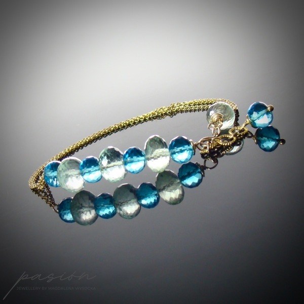 Bransoleta została ozdobiona mikrofasetowanymi oponkami Kwarcy Swiss Blue oraz jasnozielonych Fluorytów.