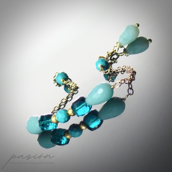 Bransoleta wykonana została z mikrofasetowanych kamieni - brioletek morskiego Amazonitu, bryłek turkusowego Kwarcu oraz naturalnego Turkusu.