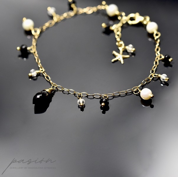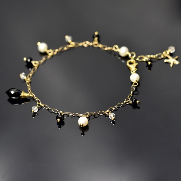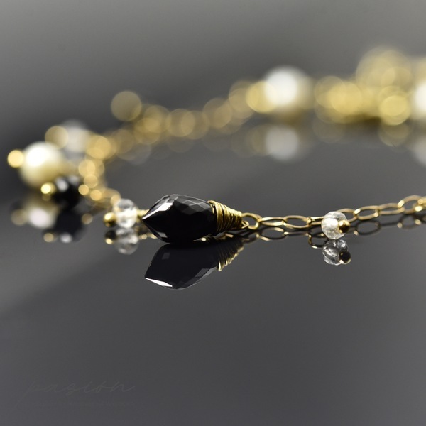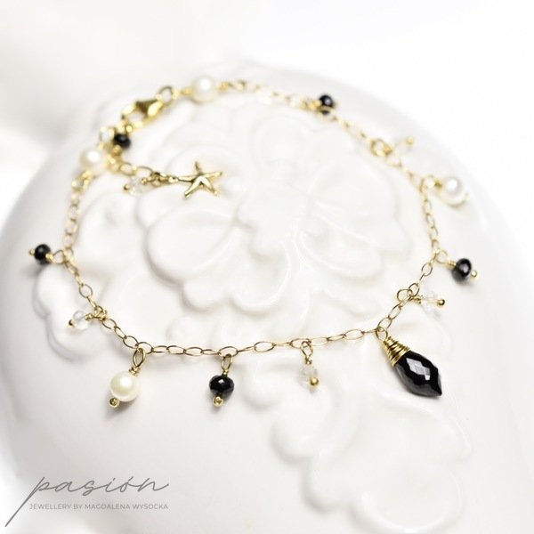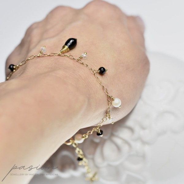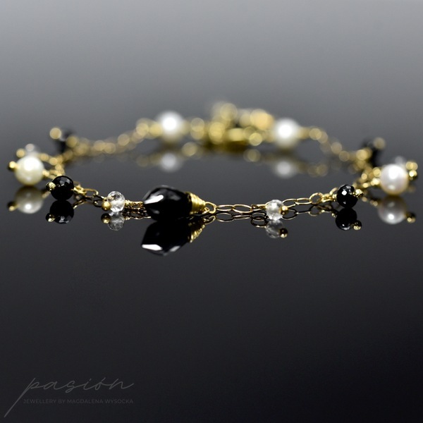Serce bransoletki stanowi niesamowicie lśniąca, przepięknie mikrofasetowana brioletka czarnego Spinelu. Wokół brioletki tańczą mikrofasetowane oponki białych Topazów i czarnych Spineli, a także naturalne Perły słodkowodne w odcieniu White Ivory.