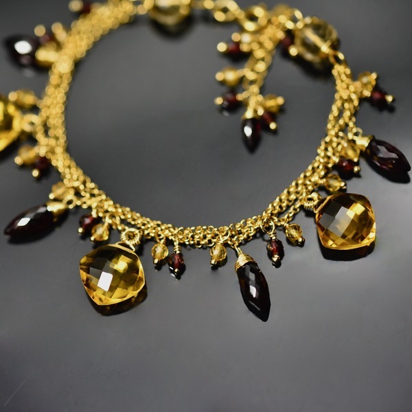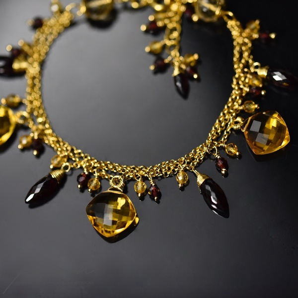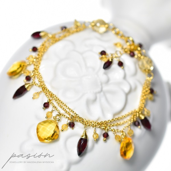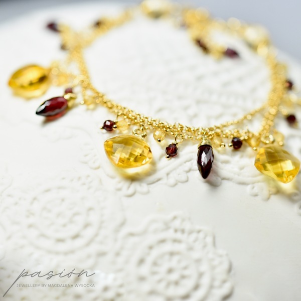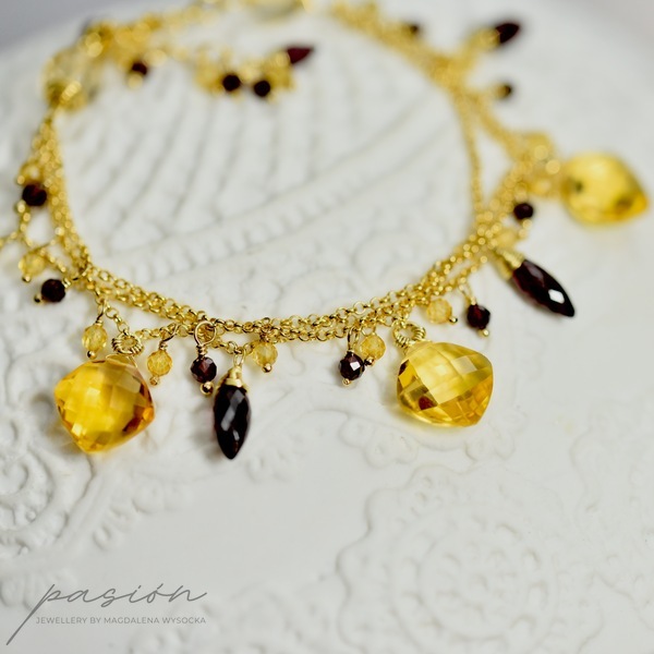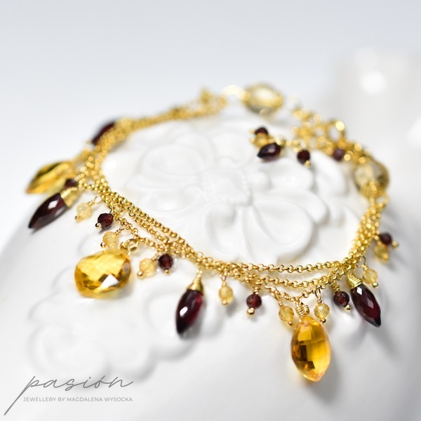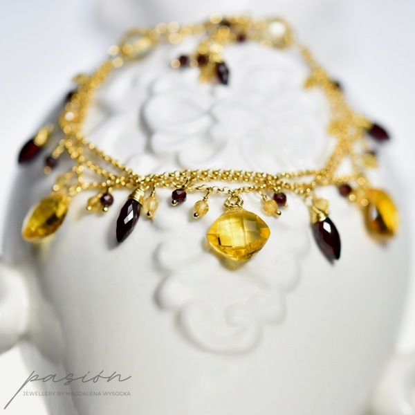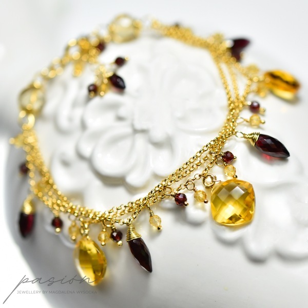Na trzech łańcuszkach wykonanych ze srebra złoconego 24ct złotem zawisły kamienie w intensywnych odcieniach: fasetowane Cytryny o niespotykanym blasku, urocze Granaty oraz Rodolity (odmiana Granatu) w odcieniach maliny i burgundu.
